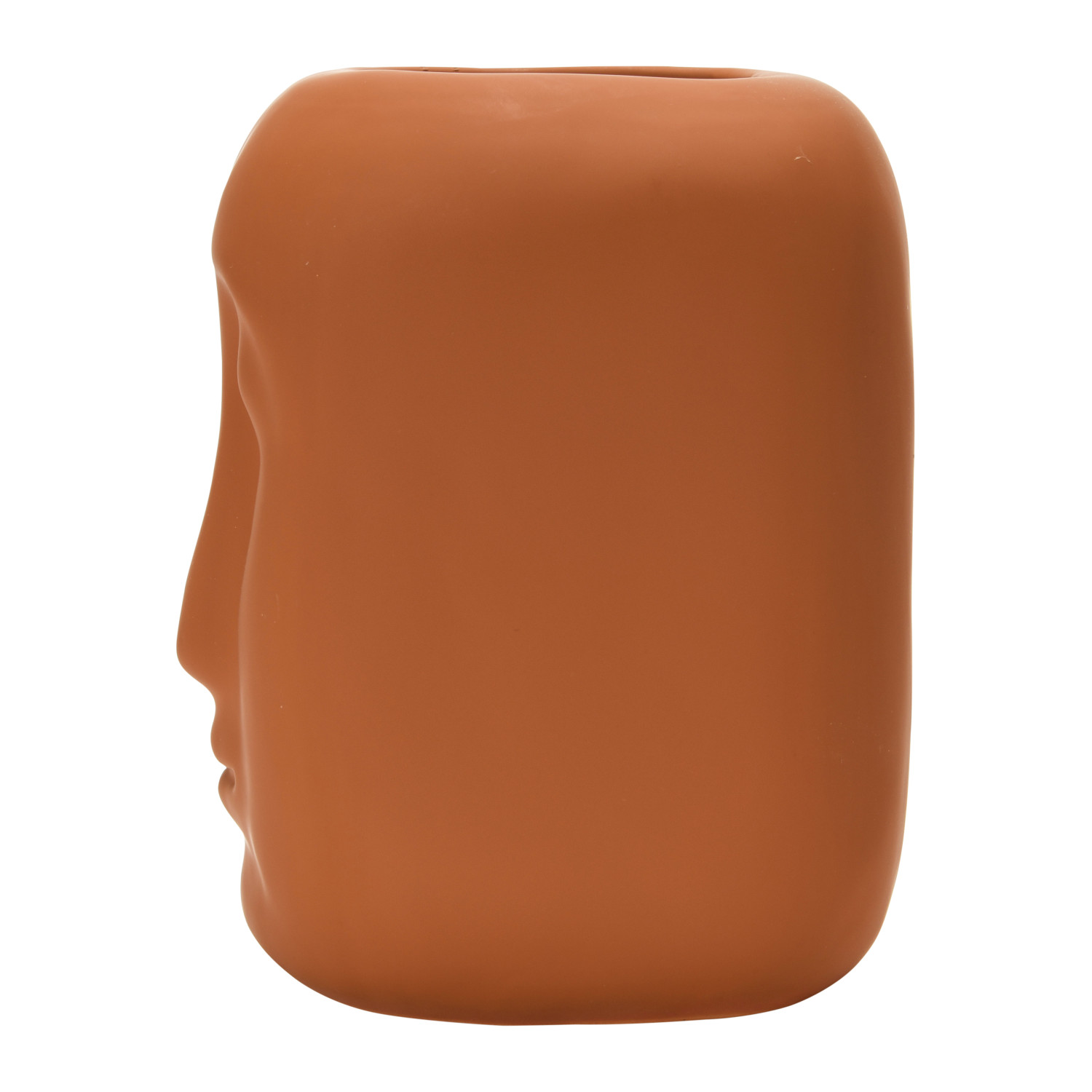 This strikingly modern planter features a serene visage carved into stoneware with a rich, matte latex glaze. Stoneware planter with carved face in matte sienna latex glaze. Add a hint of modern art to any living space with this contemporary planter. Made from 100% stoneware.