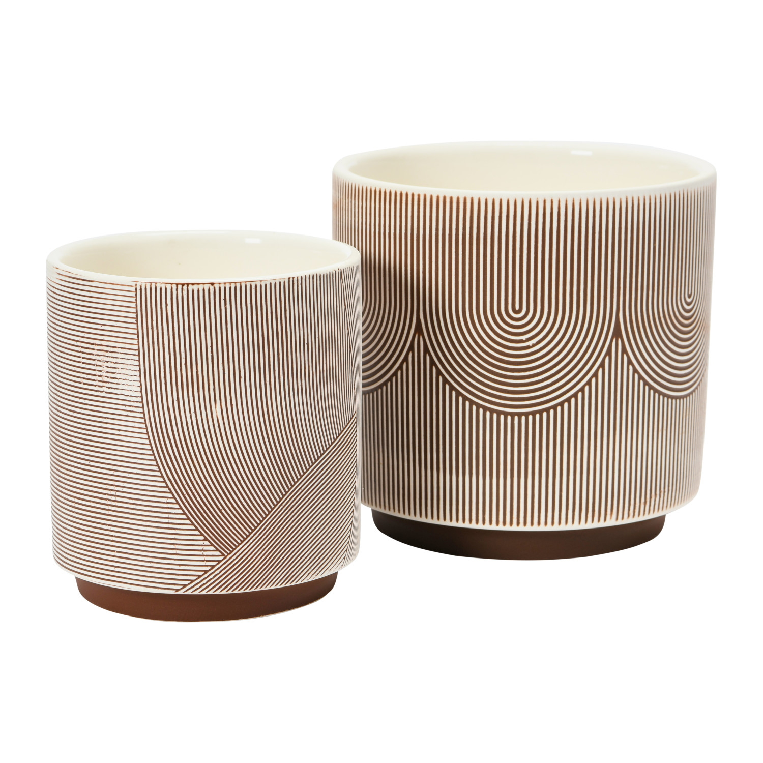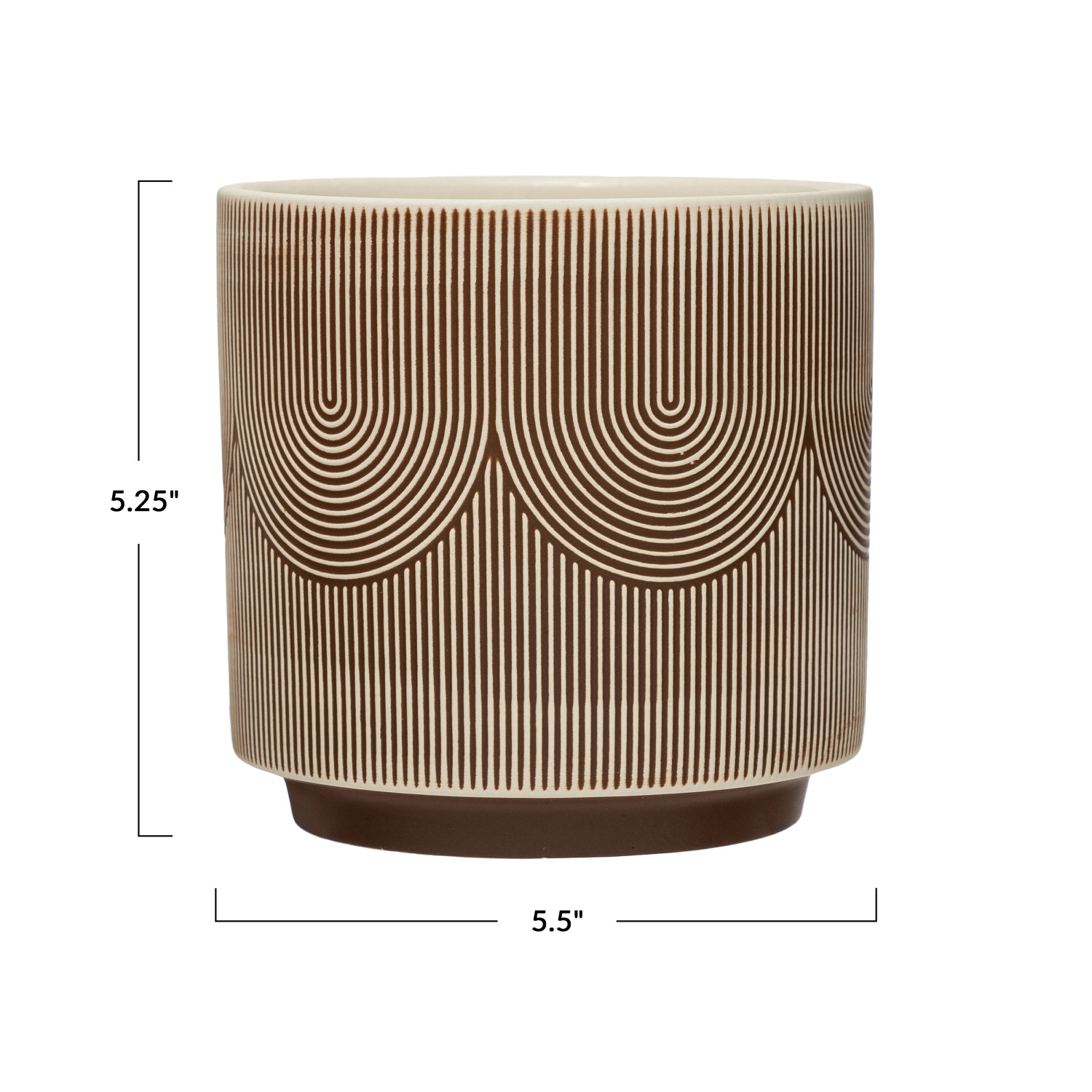 Catalog Name: 5-1/2" Round x 5-1/4"H Textured Stoneware Planter w/ Pattern, Brown & Cream Color (Holds 4" Pot)