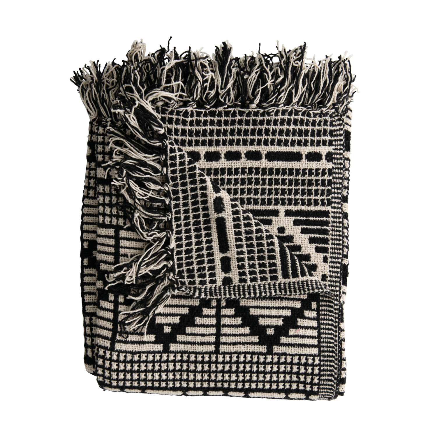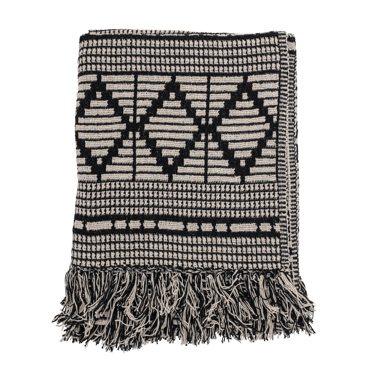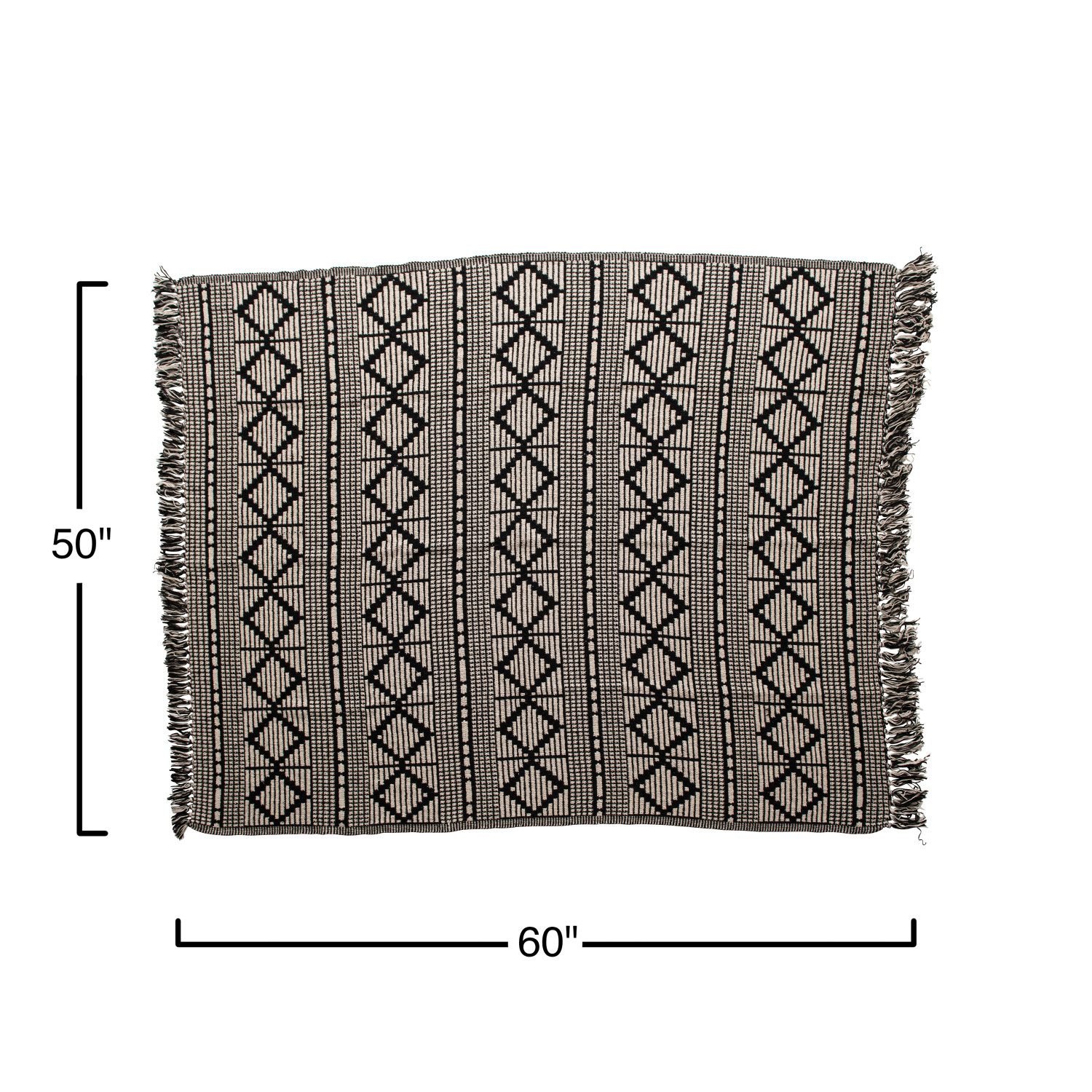 Catalog Name: 60"L x 50"W Woven Recycled Cotton Blend Throw w/ Diamond Pattern & Fringe, Black & Beige