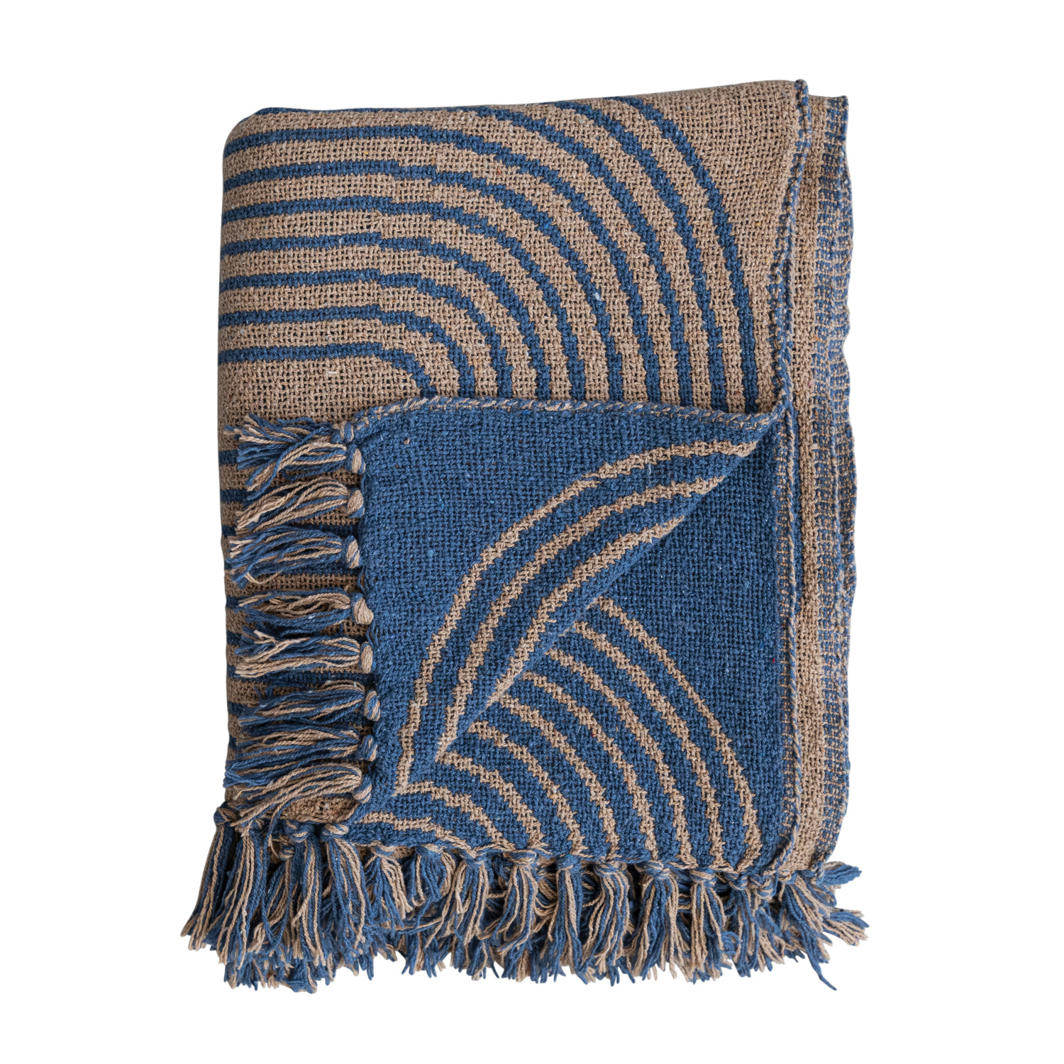Catalog Name: 60"L x 50"W Woven Recycled Cotton Blend Throw w/ Striped Pattern & Fringe, Blue & Tan Color
