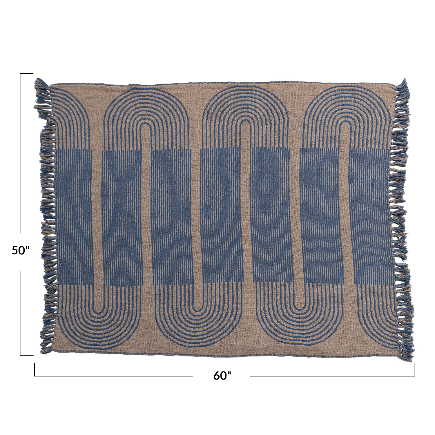 Transform the home with this woven reclaimed cotton blend throw with pattern and fringe in blue and tan. This throw blanket features a woven reclaimed cotton blend that creates a soft and cozy feel. The way adds some contrast and interest to the simple design. The pattern is abstract and colorful, giving the throw a contemporary and cheerful look. The fringe adds some texture and flair to the edges of the throw. The blue and tan color is fresh and elegant and can blend with any color scheme or theme. This throw blanket is ideal for displaying in a living space of any style, from Scandinavian to farmhouse. Use it to decorate the sofa, bed, chair, or bench. It is made from a reclaimed cotton blend, a sustainable and soft material that is good for the environment and the skin. The throw blanket measures 60 inches long by 50 inches wide, a versatile size for draping or covering. To keep it clean and fresh, just machine wash warm, gentle cycle, do not bleach, tumble dry low, warm iron if needed, or hand wash. This throw is a stylish and cozy piece that will make the home more comfortable and attractive. A stylish and cozy throw blanket with a woven reclaimed cotton blend and a bold abstract design. Ideal for displaying in a living space of any style, from Scandinavian to farmhouse. Machine wash warm gentle cycle, do not bleach, tumble dry low, warm iron if needed, or hand wash. Made of cotton and polyester.