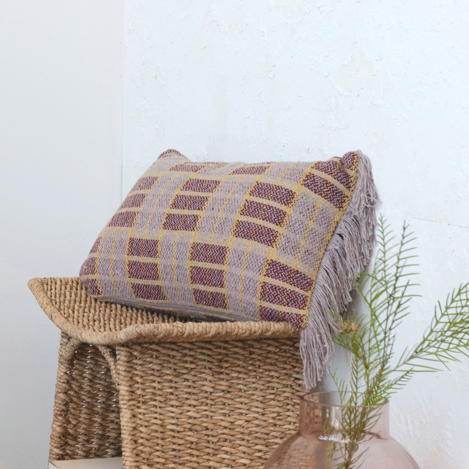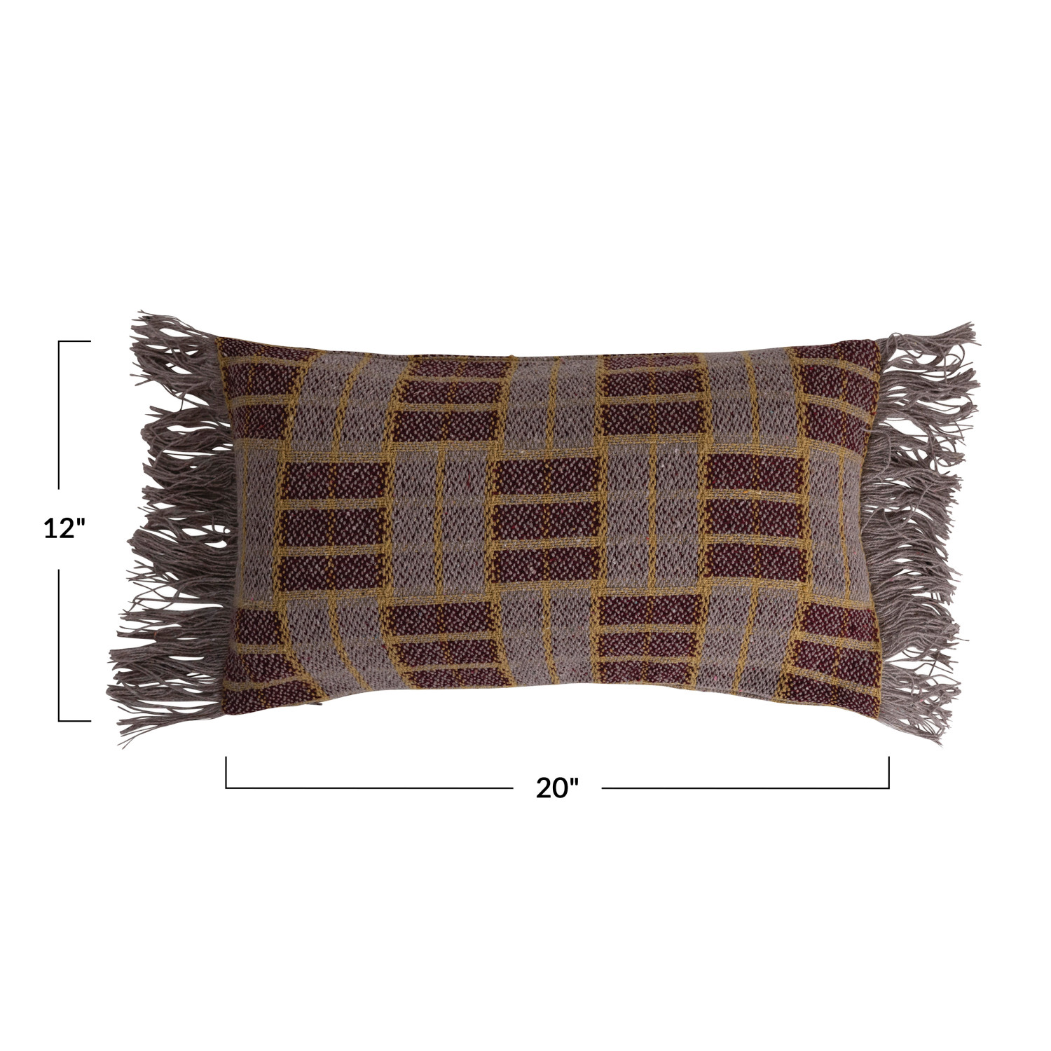 Catalog Name: 20"L x 12"H Woven Recycled Cotton Blend Lumbar Pillow w/ Fringe, Purple & Dijon Color Plaid