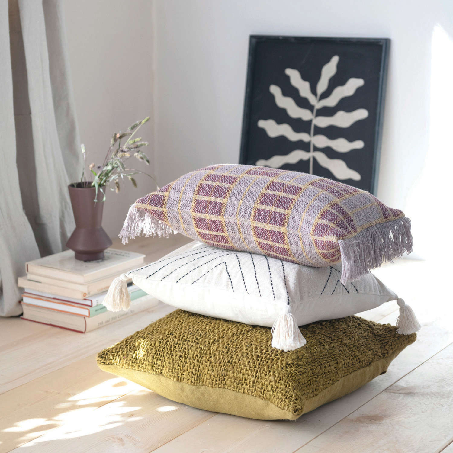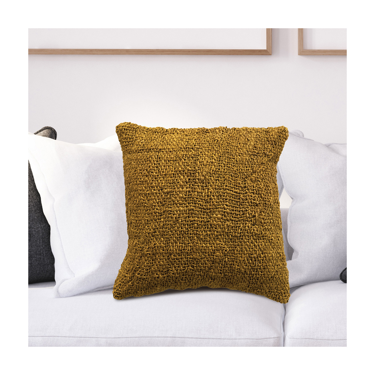 This organically woven throw pillow cover showcases cotton and jute construction in a rich finish. Square chartreuse woven cotton and jute throw pillow; Tonal cotton encasement on back. Express your constantly evolving style with the simple addition of this eye-catching pillow. Removable cotton throw pillow cover with polyester insert; Back zipper with hidden flap; Spot clean only.