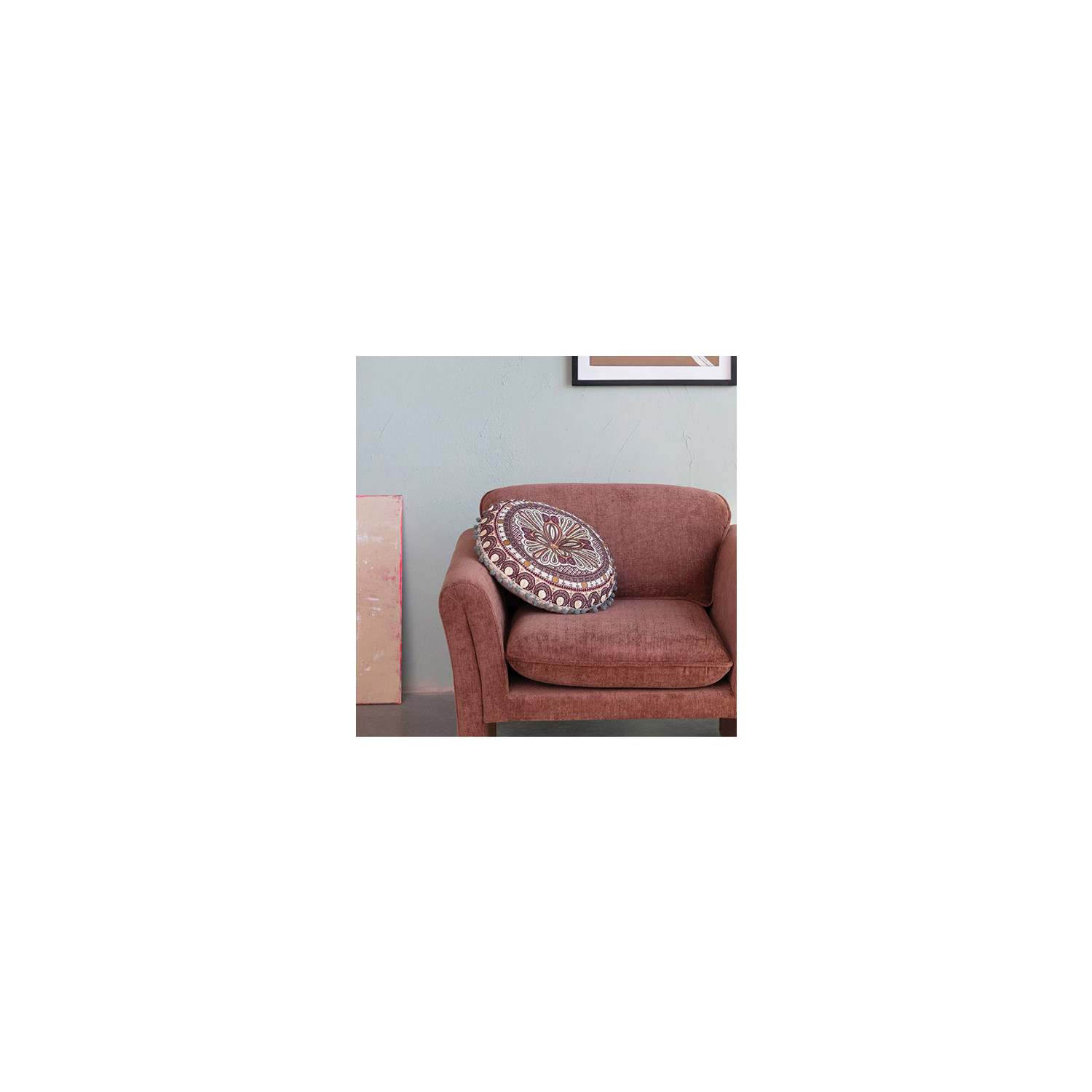 This bold throw pillow features an intricately embroidered Scandinavian print on cotton, finished with playful pom poms. Multicolor round cotton throw pillow with embroidered print and pom pom trim; Natural cotton encasement on back. Express your constantly evolving style with the simple addition of this eye-catching pillow. Round throw pillow; Spot clean only.