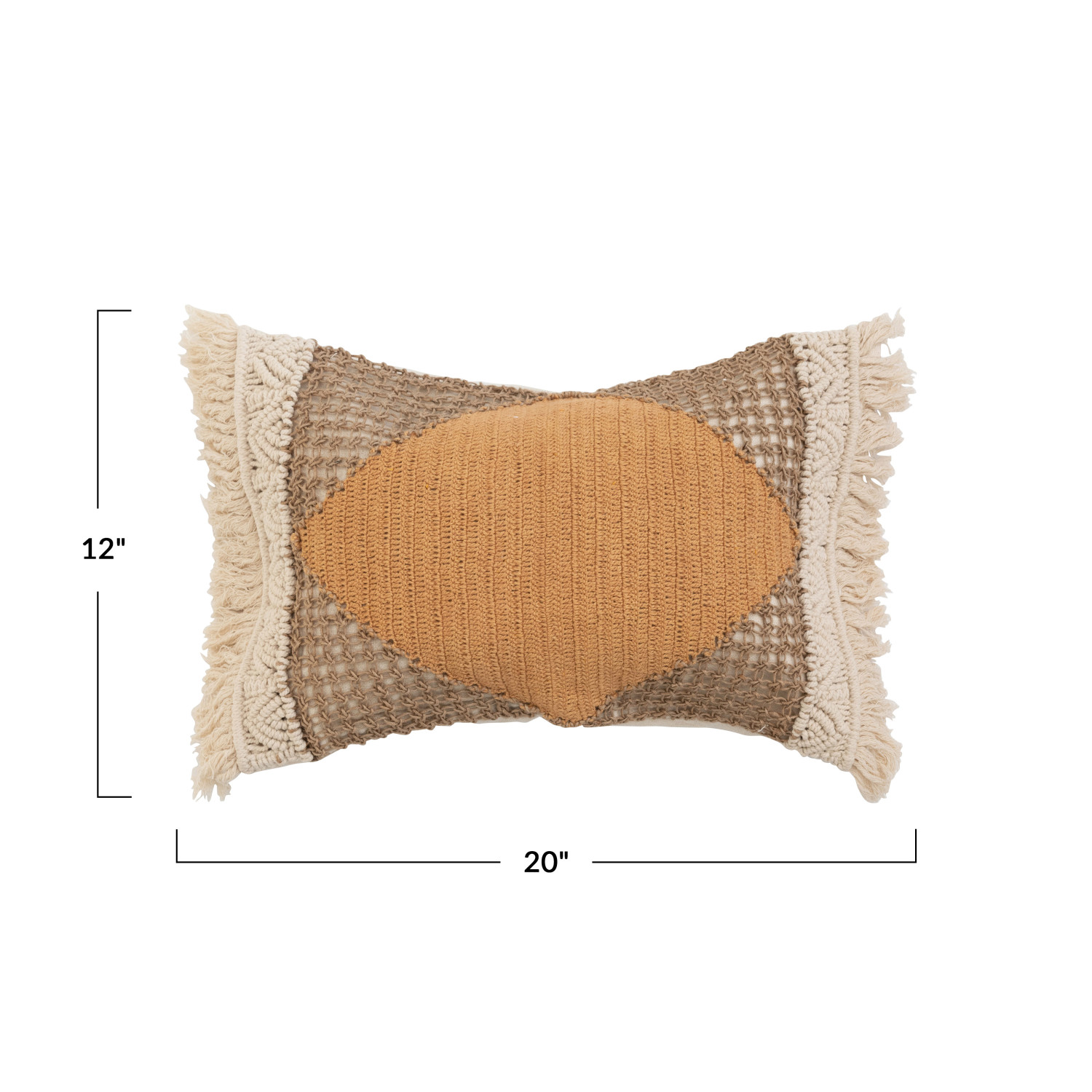 Catalog Name: 20"L x 12"H Cotton & Jute Lumbar Pillow w/ Macrame, Crochet & Fringe, Multi Color