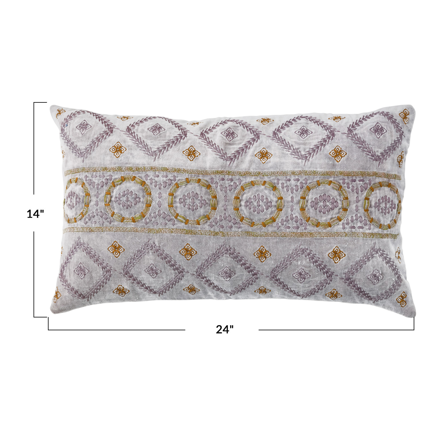This global inspired lumbar pillow features supple cotton velvet finished with intricately embroidered geometric patterns. Display in a bedroom or living space of any style from Scandinavian to global. Machine Wash Warm Gentle Cycle, Do Not Bleach, Tumble Dry Low, Warm Iron If Needed or Hand Wash. Made from cotton.
