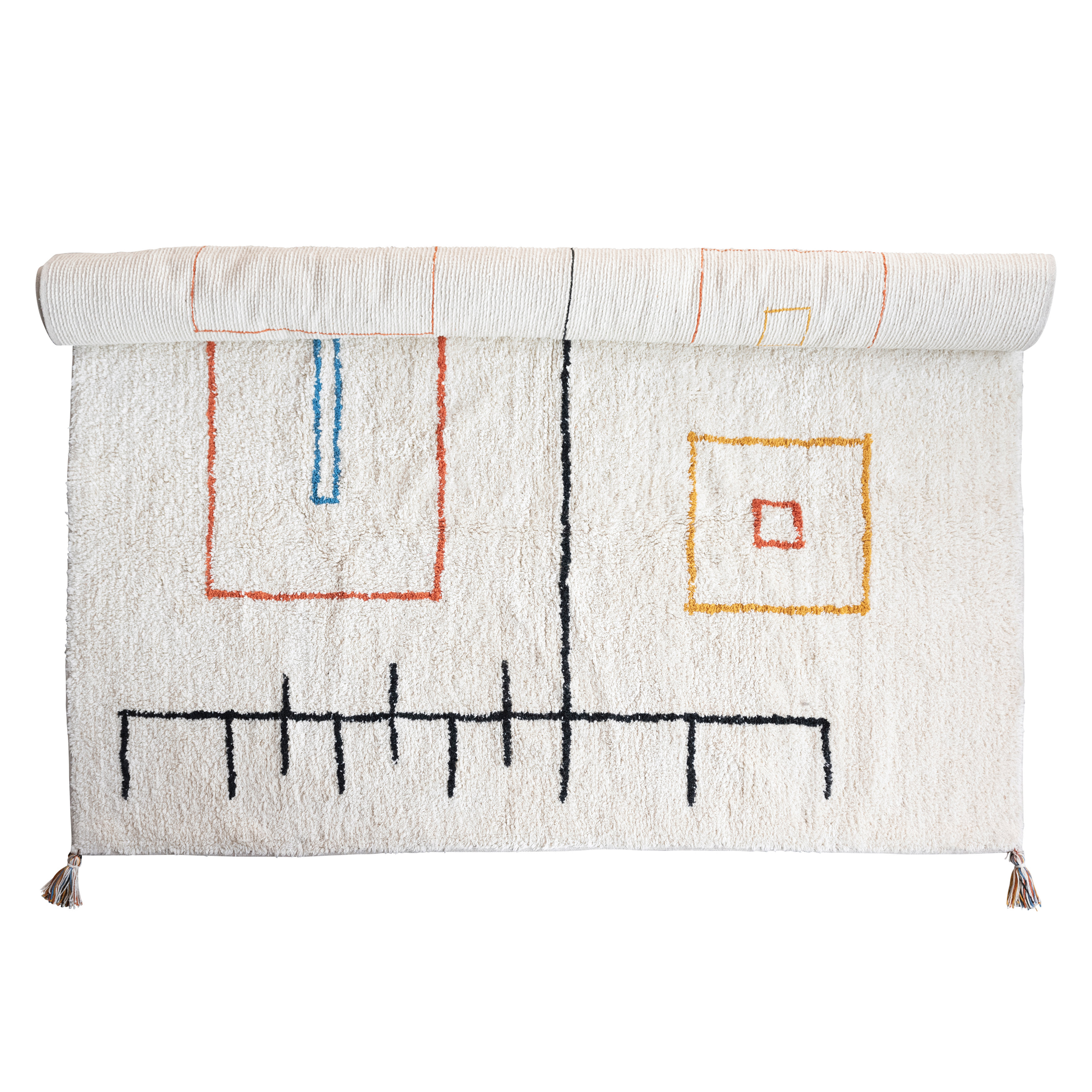 This contemporary, southwestern influenced area rug showcases supple, tufted cotton with an abstract design, finished with decorative tassels. Multicolor tufted cotton rug with abstract pattern and tassels. Spot clean only. Made from 100% cotton blend.