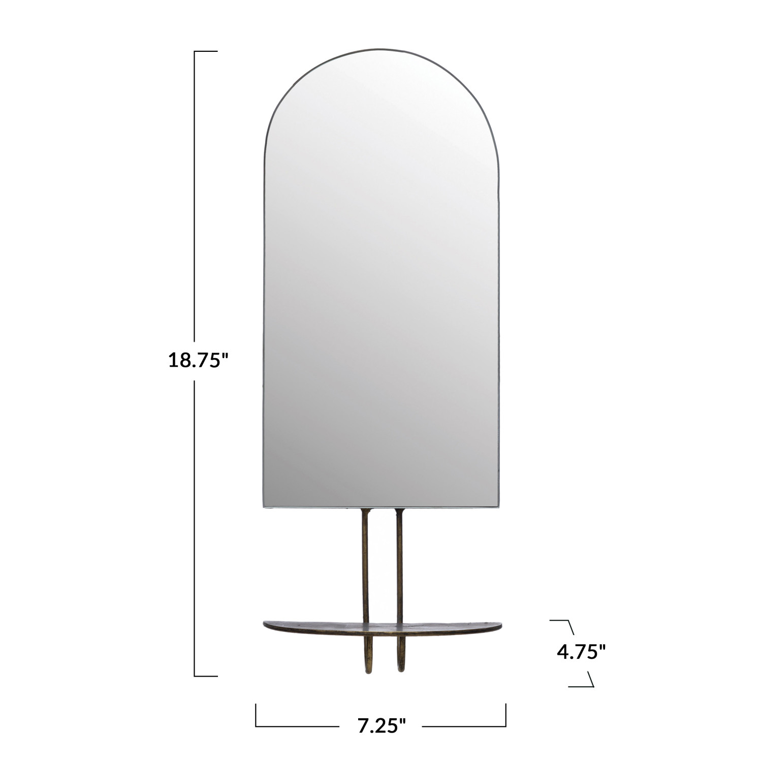 This strikingly modern wall mirror features an arched silhouette encased in a sleek metal frame with an attached shelf. Arched wall mirror with antique gold metal frame and attached shelf. Add style and depth to any living space with this artfully crafted mirror. Made from glass and iron.