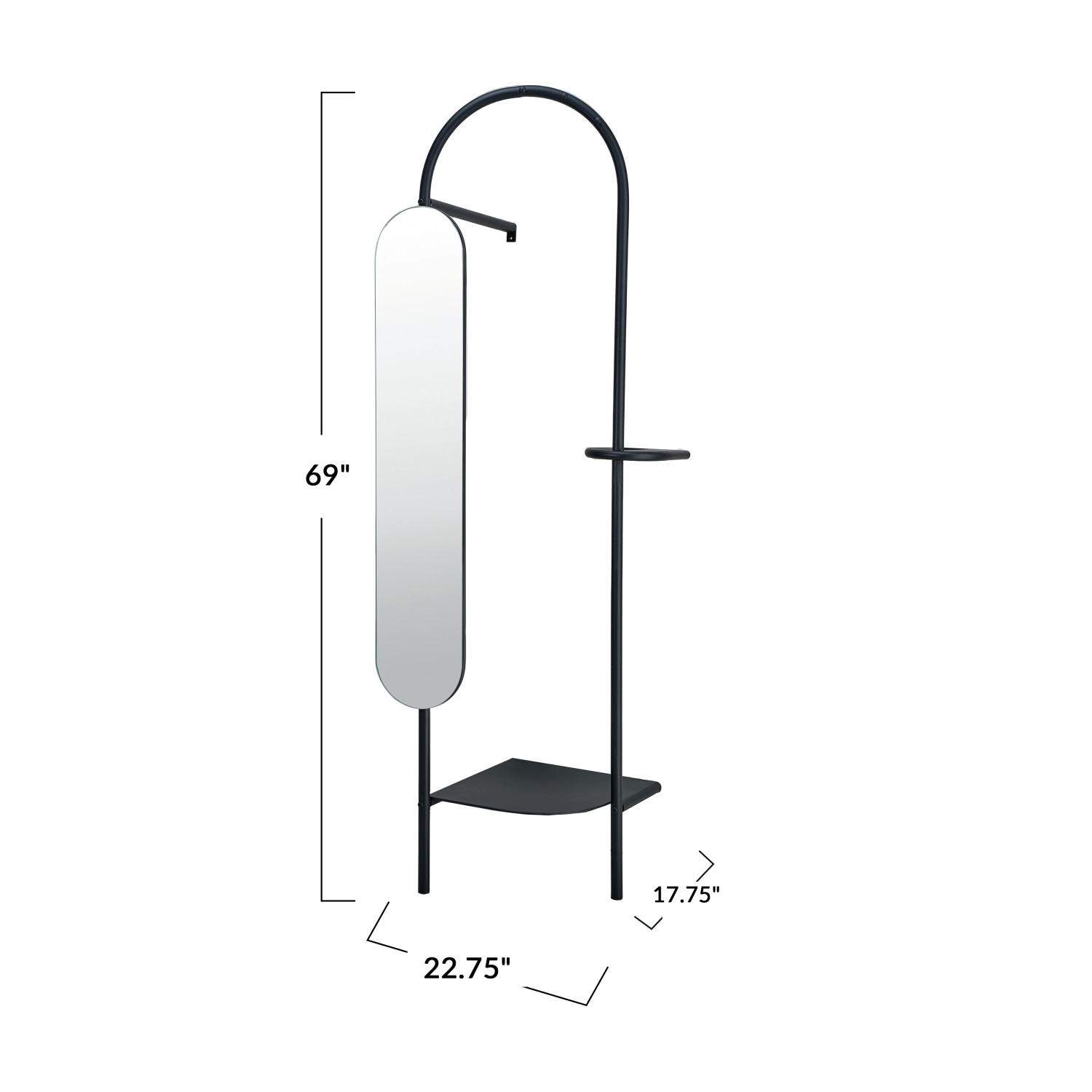 This Versatile Vogue Metal Dressing Mirror is the epitome of chic functionality. Standing tall at 69 inches, with a length of 22.75 inches and a width of 17.75 inches, it's more than just a mirror; it's a statement piece that organizes essentials. The black metal frame encases the reflective glass, while three hooks, two rods, and one shelf provide ample space for hanging and storing daily wear. Whether dressing up for the day or accessorizing for the evening, this mirror is the perfect companion for keeping fashion favorites. Its knock-down design ensures easy transport, making it a stylish and practical choice for any contemporary home.