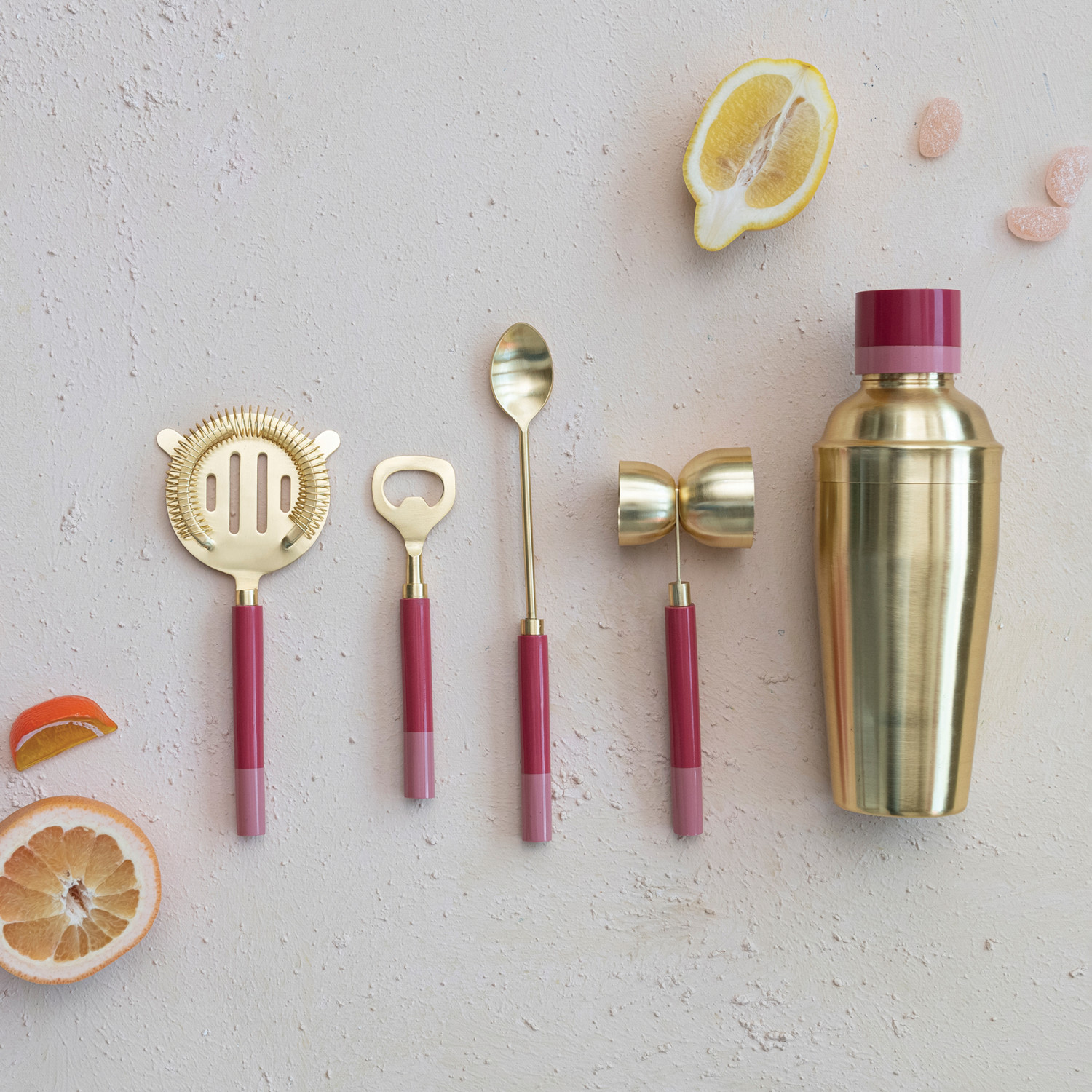 Catalog Name: 4-1/2"L - 10"L Stainless Steel Bar Tools w/ Resin Handles, Brass Finish and Pink, Set of 5 in Printed Drawstring Bag