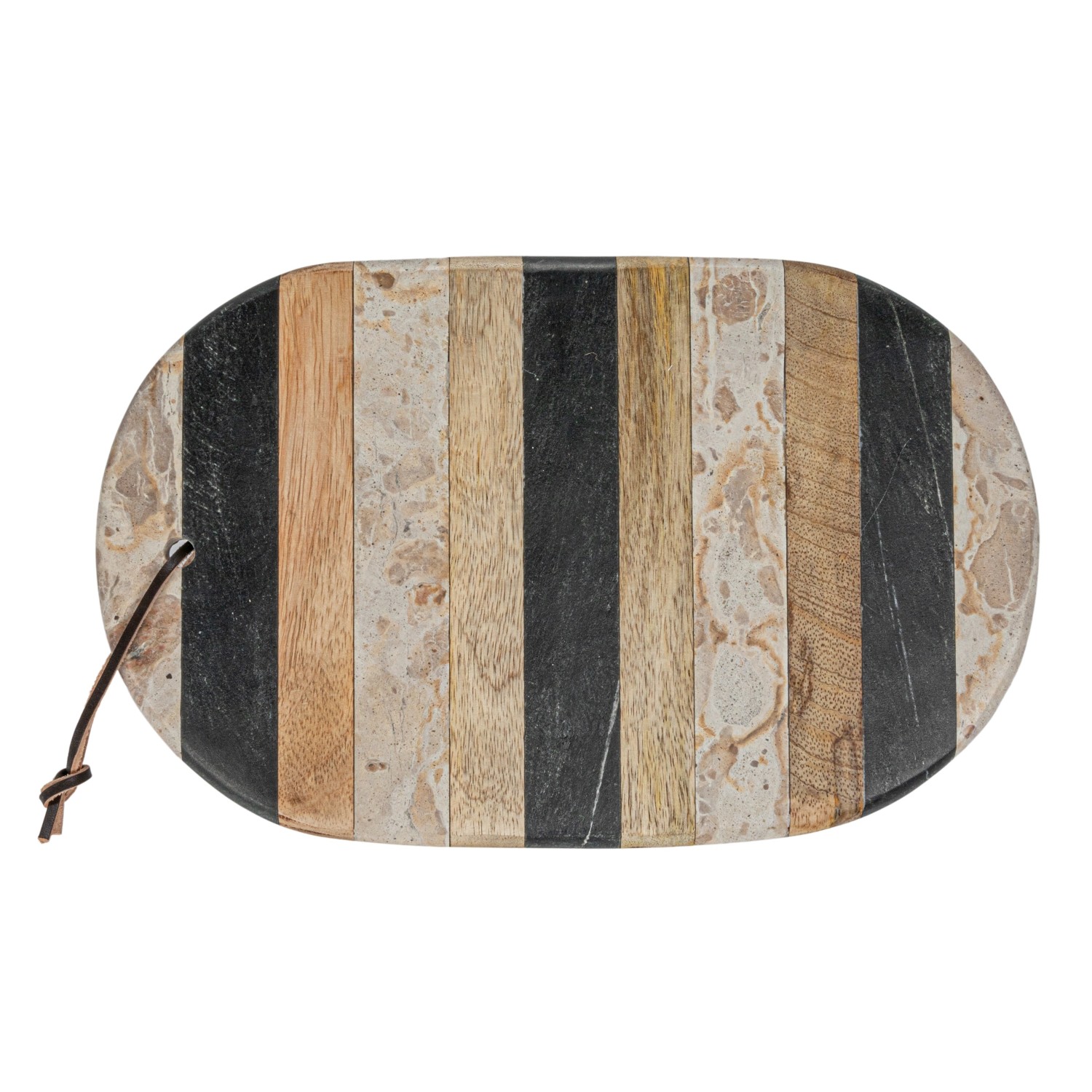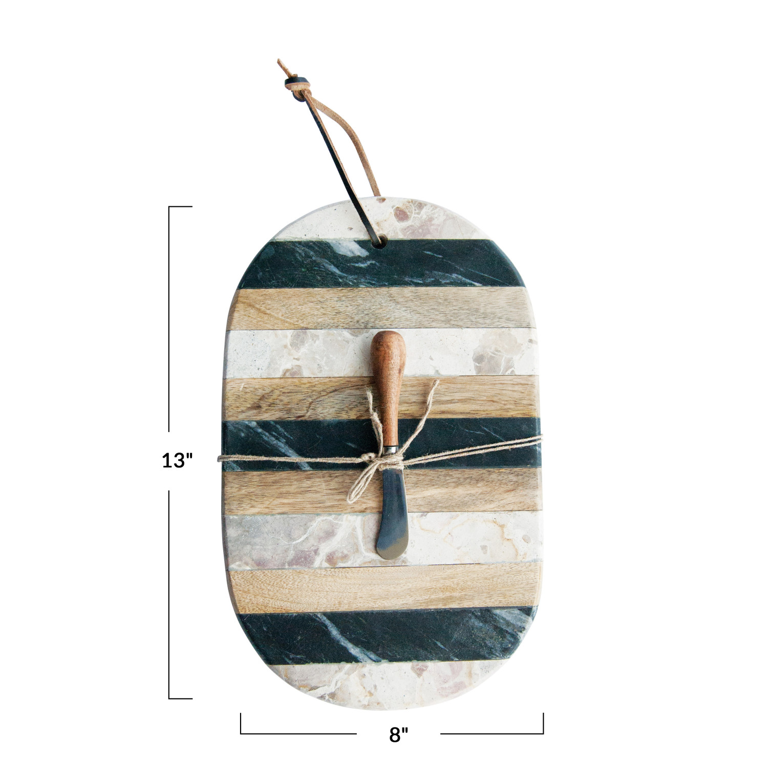 Catalog Name: 13"L x 8"W Oval Marble & Mango Wood Striped Cheese/Cutting Board w/ Leather Tie & Stainless Steel Canape Knife, Black, Beige & Natural, Set of 2 Tied w/ Jute