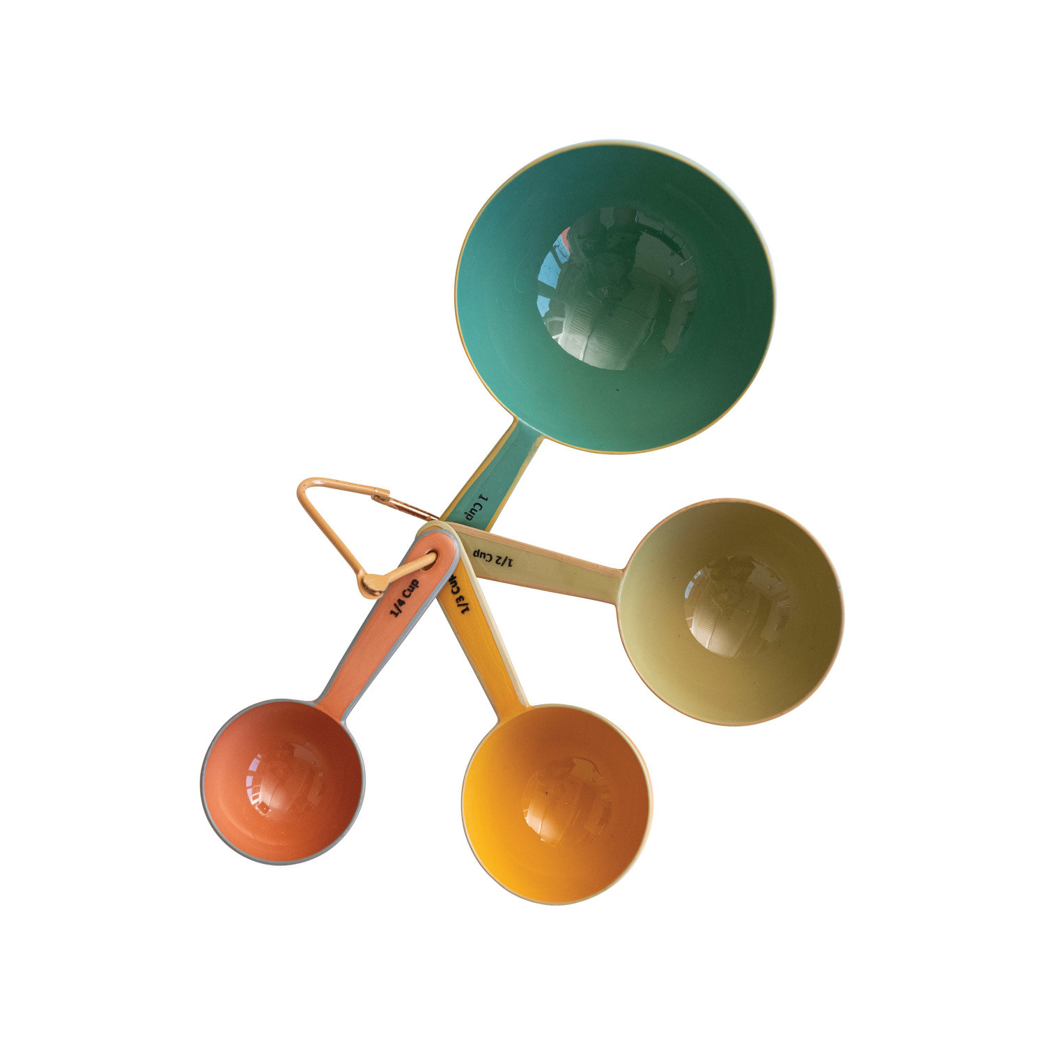 This set of four enameled stainless steel measuring spoons is a must-have for any cooking and baking enthusiast. These spoons are made of durable stainless steel, able to withstand high temperatures and frequent use. The colors green, yellow, orange, and yellow green add a lively and cheerful look to the kitchen. They are functional, stylish, and versatile, making them easy to use and store. They can be used to measure ingredients, mix sauces, or sprinkle spices. They are perfect for any kitchen with a touch of cottagecore, modern, boho, Scandinavian, or glam style. They are dishwasher-safe and easy to clean. The spoons have capacities of 1 cup, 1/2 cup, 1/3 cup, and 1/4 cup. This set makes a great gift or addition to any kitchen.
