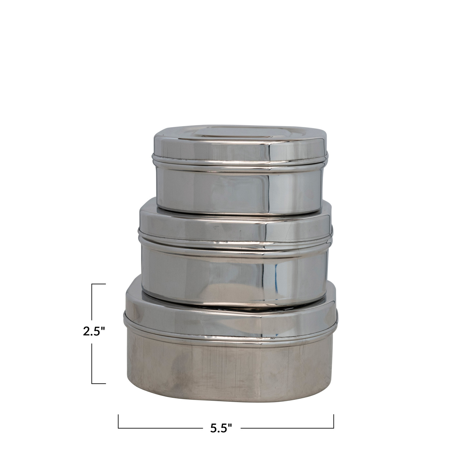 Catalog Name: 5-1/2" Square x 2-1/2"H, 5" Square x 2"H & 4-1/2" Square x 1-3/4"H Stainless Steel Containers, Set of 3