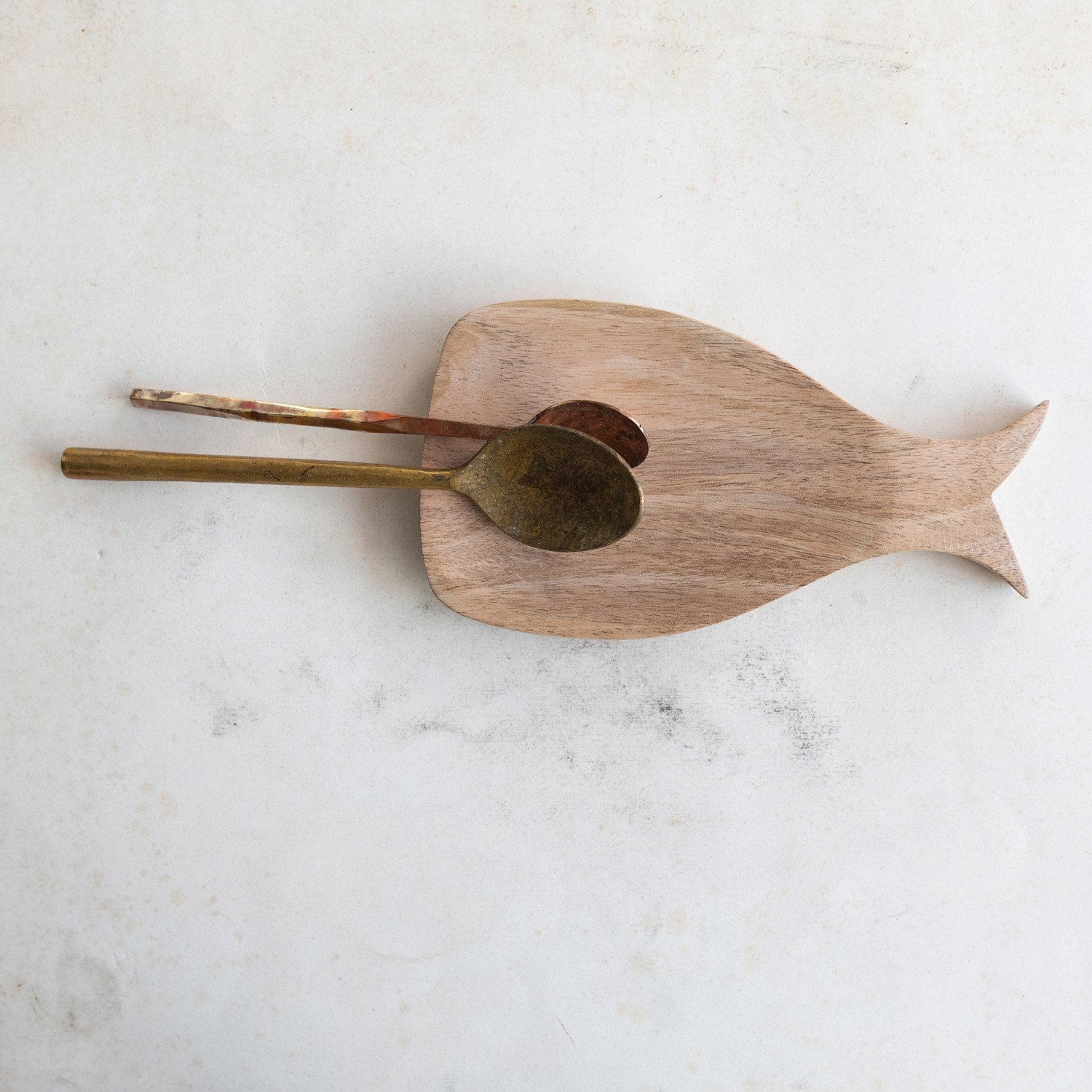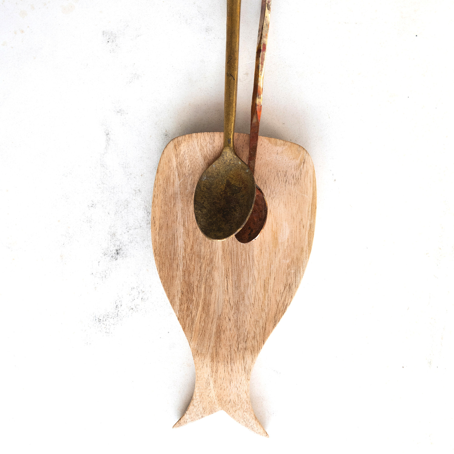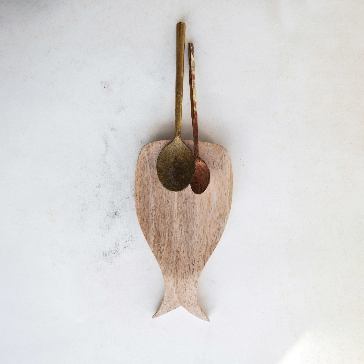 This coastal inspired spoon rest showcases a whimsical mango wood whale silhouette.