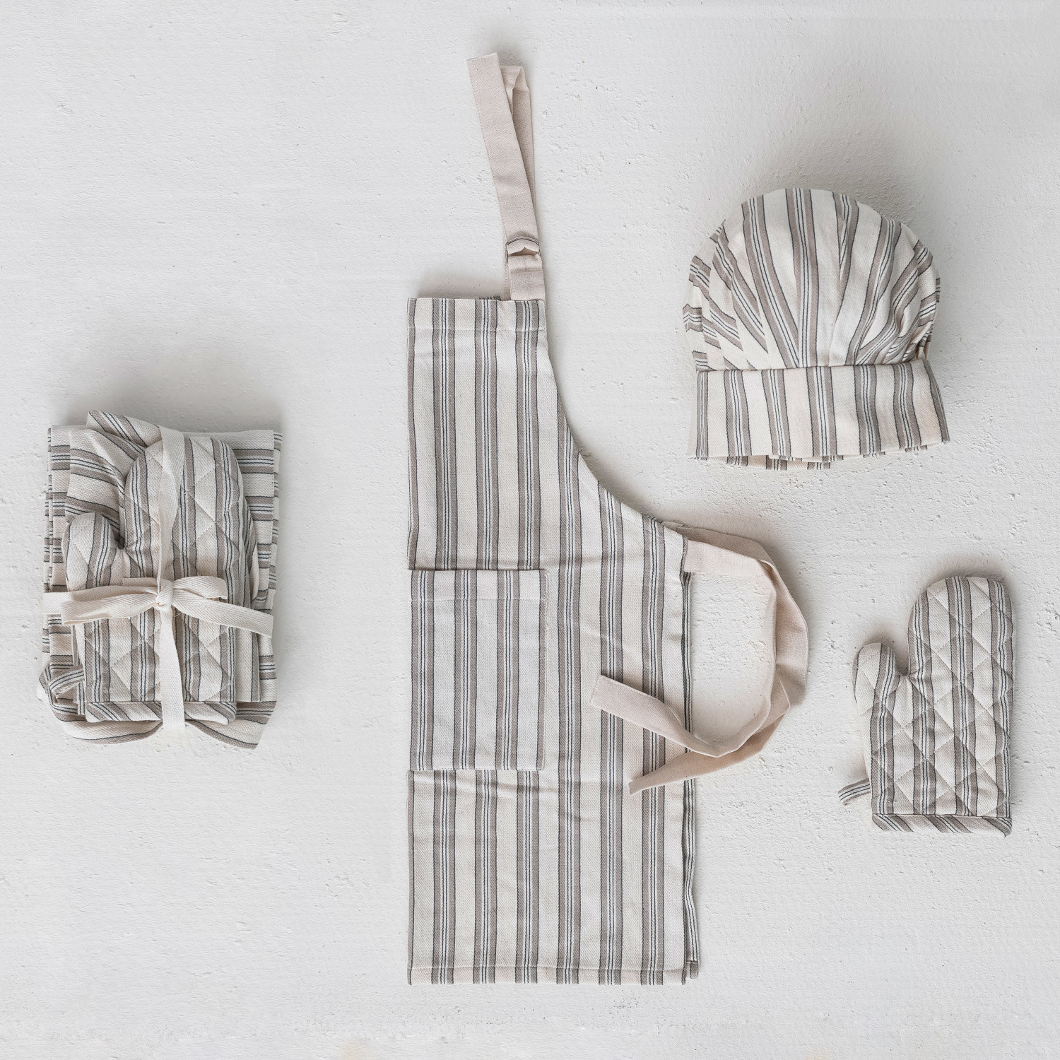 Catalog Name: 24"L x 20"W Cotton Child Apron w/ Chef Hat, Oven Mitt & Stripes, Cream Color, Black & Natural, Set of 3 Tied w/ Cotton Tape