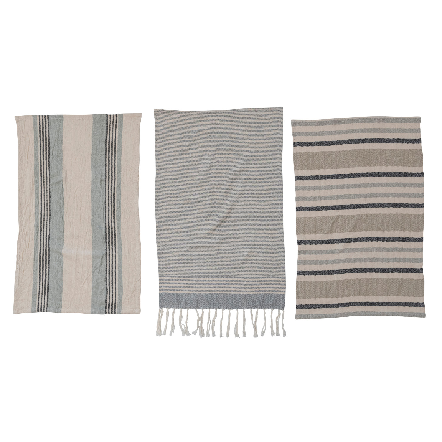 Featuring a vast selection of lush woven textures, intricate details, and timeless patterns, our collection of kitchen textiles will bring warmth and elegance to a dining space of any style. Instantly transform a breakfast nook or dining room into a sophisticated sanctuary by exploring a vast array of textiles and accessories fit for any space including table runners, napkin sets, placemats, napkin rings, tea towels, dish cloths, sponge cloths, pot holders, food pouches, aprons, and so much more. Choose from a wide variety of luxurious fabrics from cotton and velvet to linen and seagrass, and styles from mid-century modern and boho to classic farmhouse and contemporary. This casual set of cotton tea towels features a striped pattern and decorative fringe tied with a jute and wood bead tie. Display in a living or dining space of any style from farmhouse to cottage. Machine Wash Warm, Gentle Cycle, Do Not Bleach, Tumble Dry Low, Warm Iron If Needed. Made from cotton.