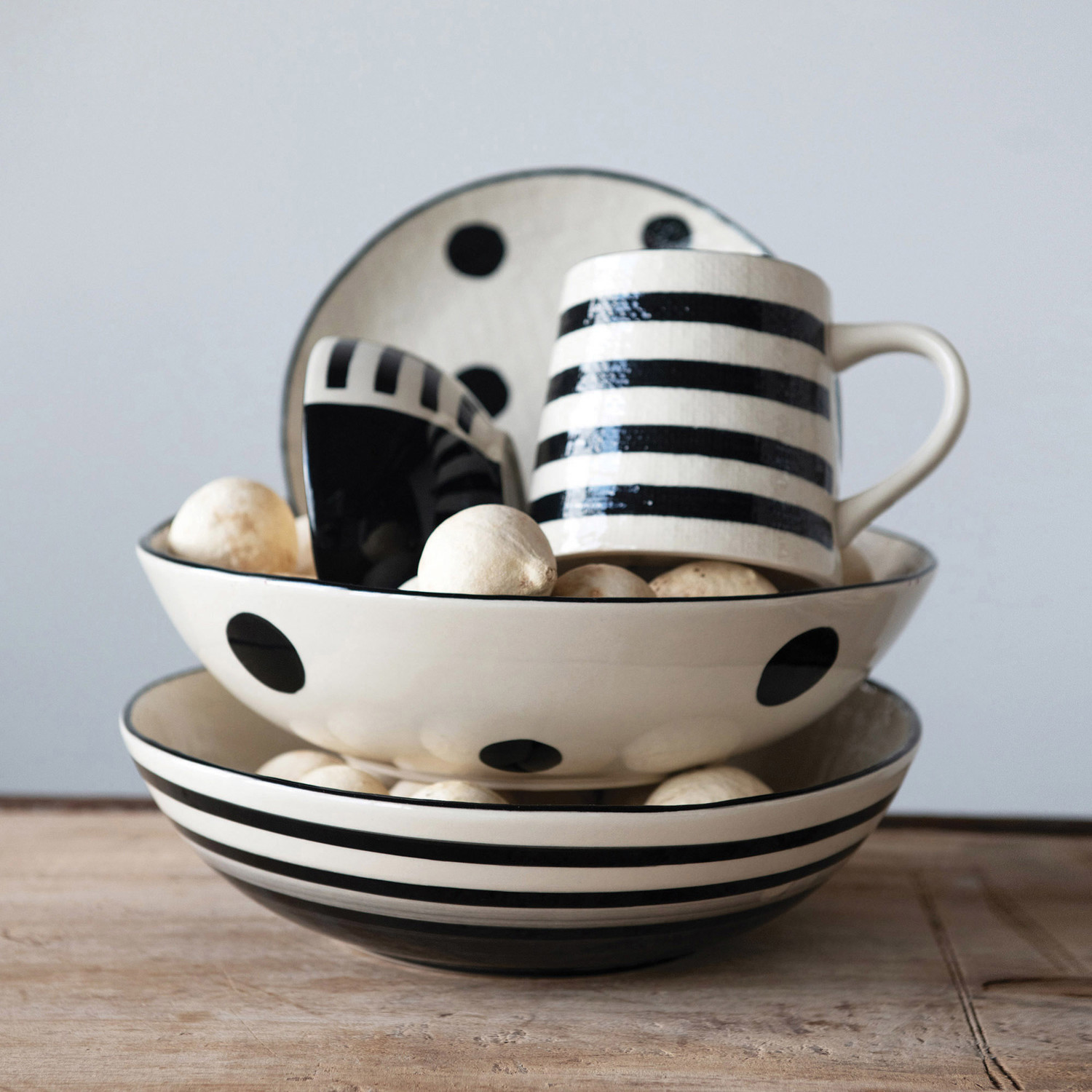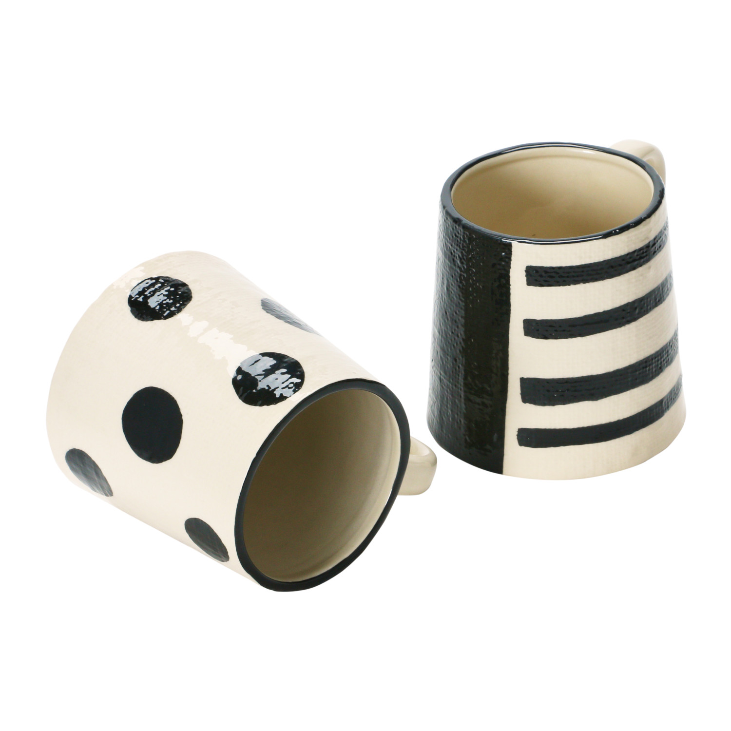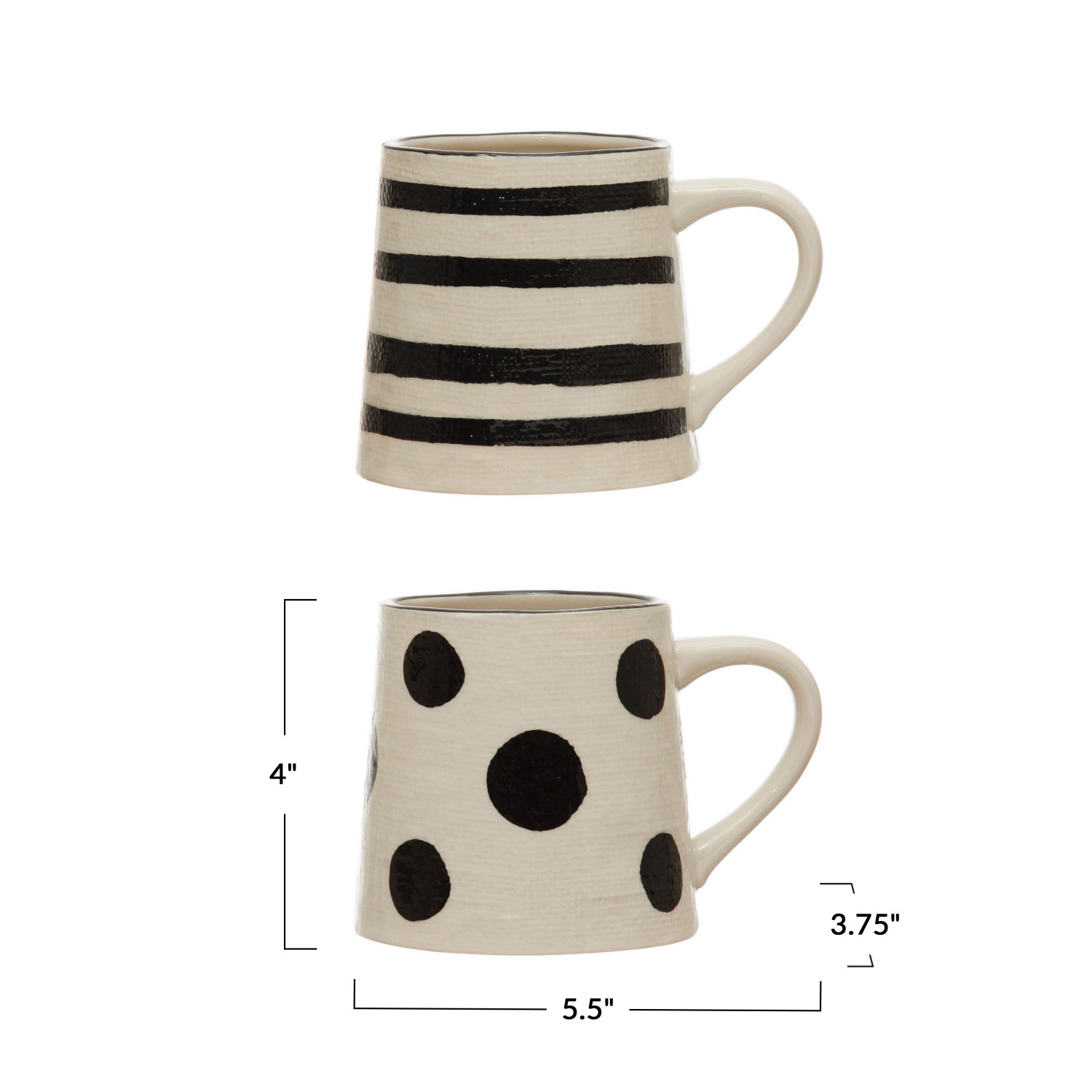 Catalog Name: 3-3/4" Round x 4"H 12 oz. Hand-Painted Stoneware Mug w/ Linen Texture, Black & Cream Color, 2 Styles
