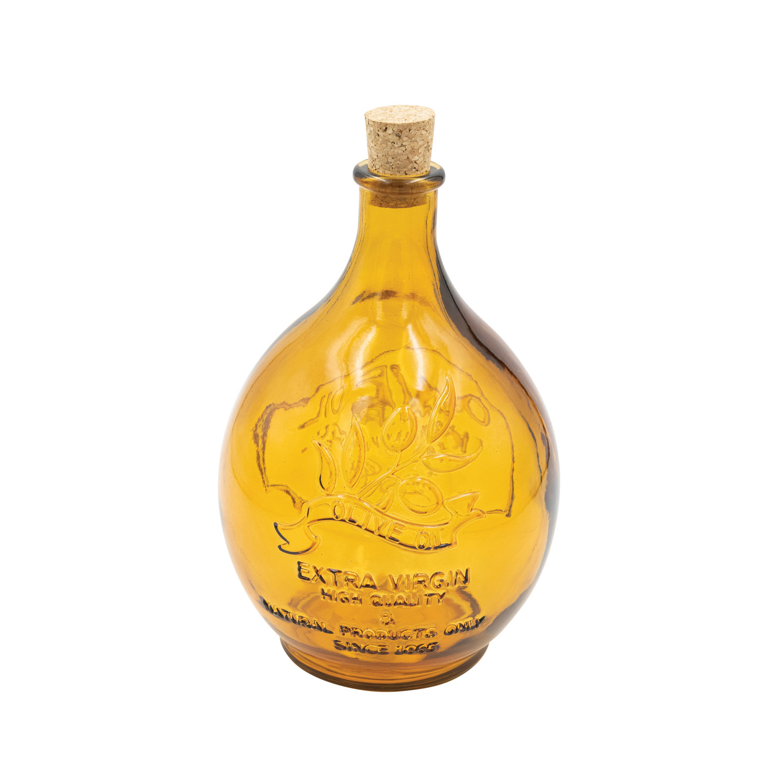 This embossed reclaimed glass bottle with cork stopper, amber color "Olive Oil Extra Virgin," is a lovely and practical way to store and display olive oil. It is made from reclaimed glass recycled from old bottles and jars, giving it a distinctive look and feel. It has an amber color that adds warmth and charm to the bottle. It has a cork stopper that keeps the contents fresh and prevents spills. It has an embossed label on the front that reads "Olive Oil Extra Virgin," on the front. The warm amber color of the glass complements any French country, farmhouse, vintage, or cottagecore kitchen decor. The bottle measures 5 inches in diameter and 7.25 inches in height. Whether used for cooking, dressing salads, or simply as a decorative accent, this amber glass olive oil bottle with a cork stopper adds rustic elegance to the home.