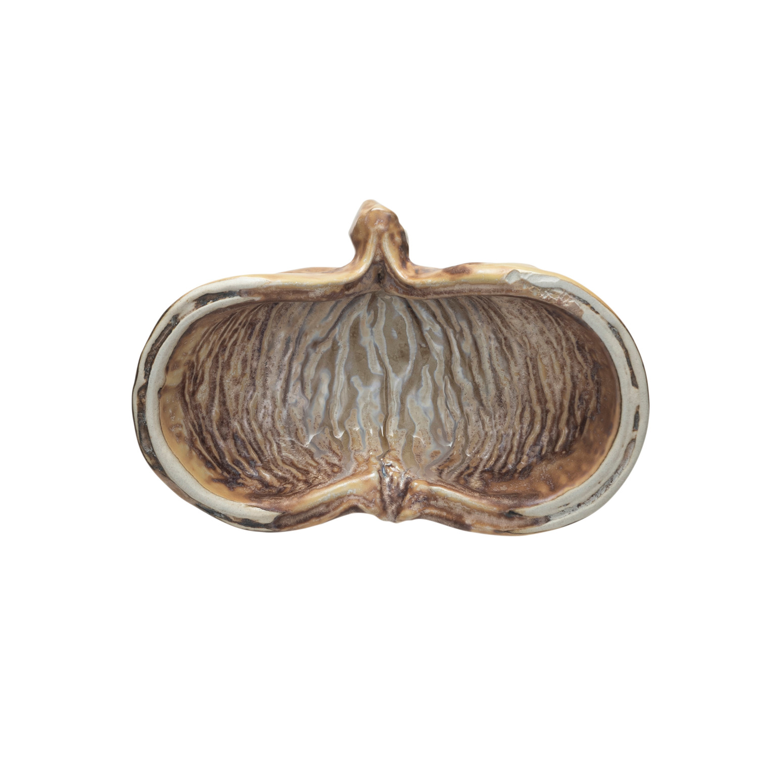 Catalog Name: 5"L x 3-1/4"W Stoneware Pod Shaped Dish, Reactive Crackle Glaze, Brown & Cream Color (Each One Will Vary)