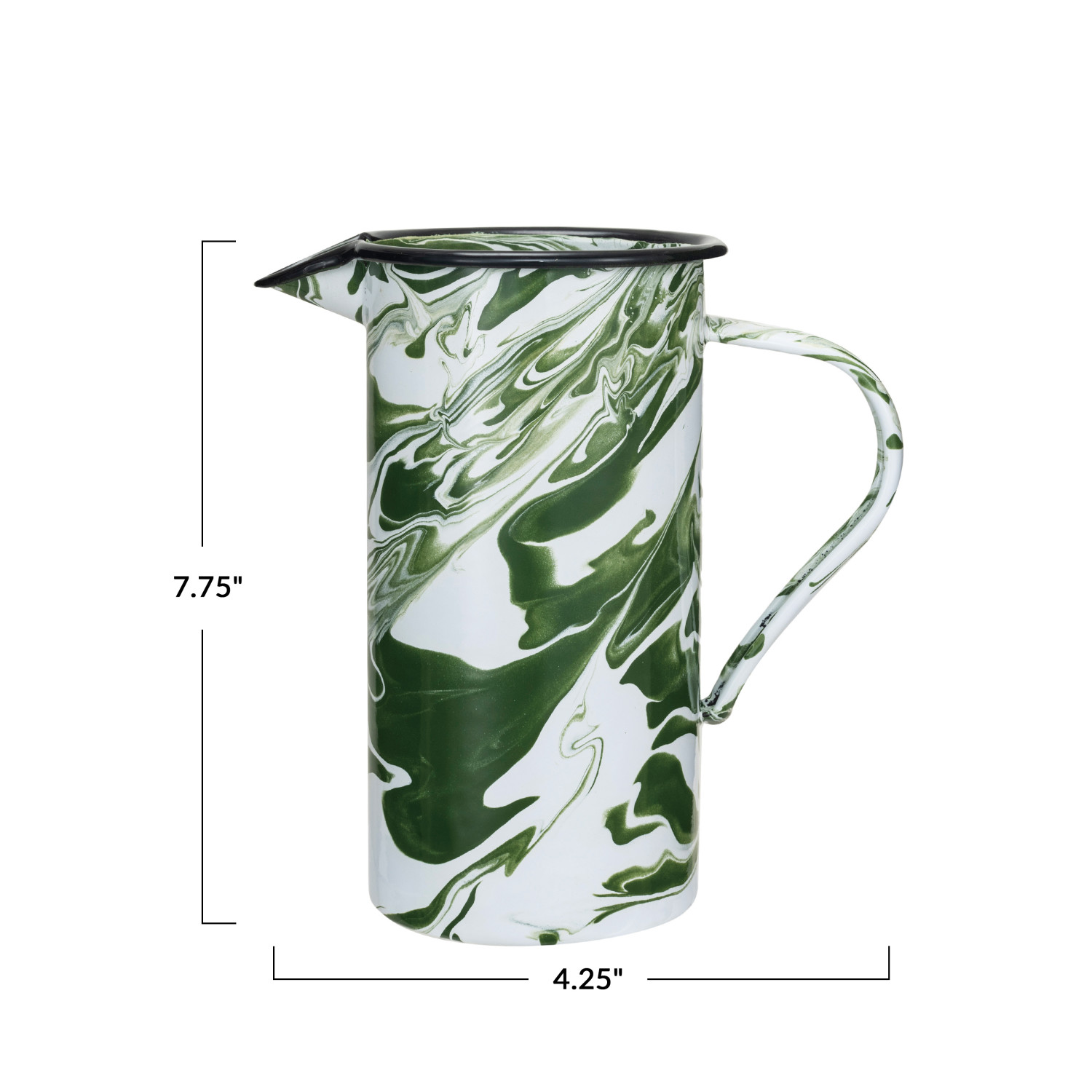 This green and white marbled enameled pitcher with black rim is a charming addition to any serveware collection. Its elegant design features a unique and elegant green and white marbled enamel coating, while the black rim adds contrast. The pitcher is made of durable metal, resistant to high temperatures and frequent use. The smooth enamel coating protects the metal from rusting and corroding, making it easy to clean and maintain. It can hold up to 40 ounces of liquid and is suitable for serving water, juice, tea, or other beverages. The pitcher has a curved handle, spout, and round shape for comfortable holding. It can suit any style, from farmhouse to French country, and adds a cozy touch to the table. Measuring 4.25 inches in diameter and 7.75 inches in height, it can serve a large group of guests.