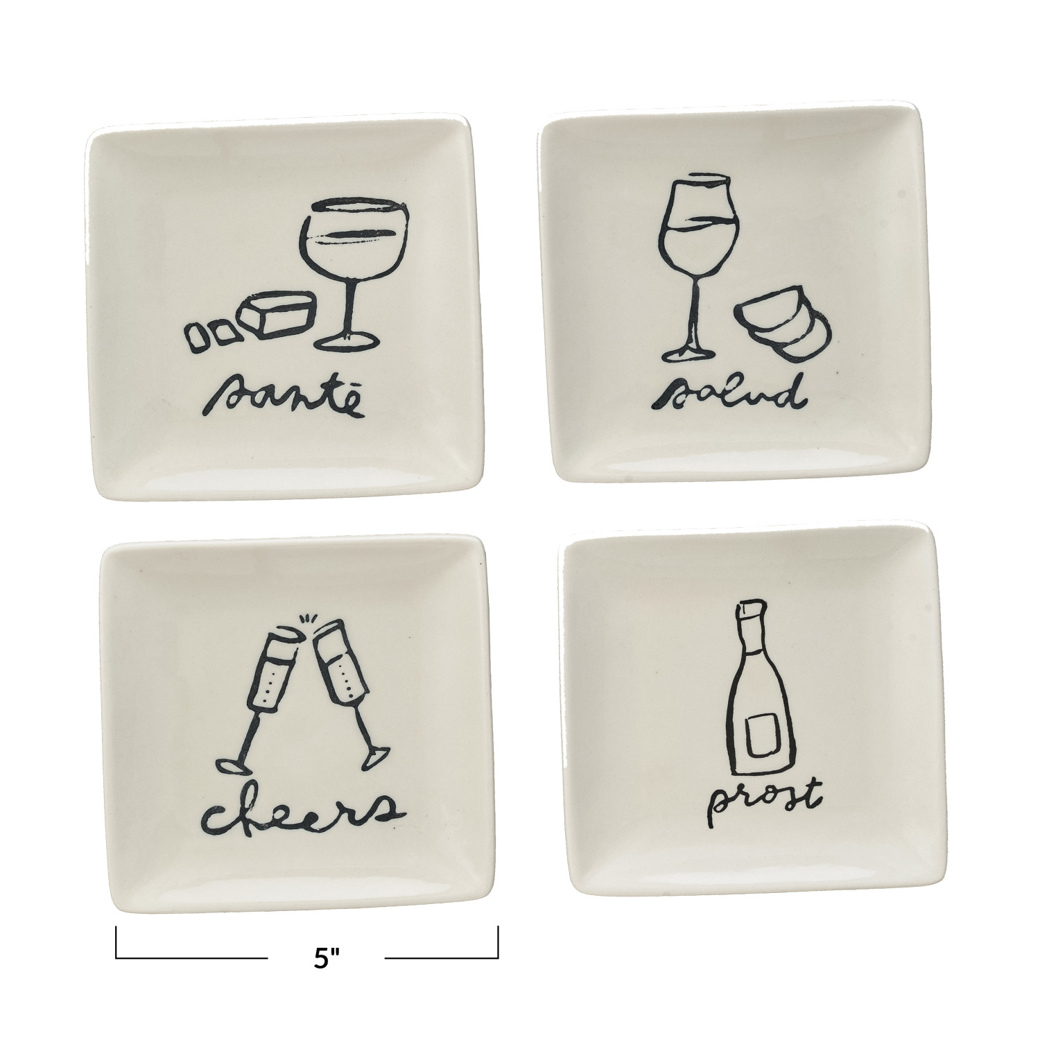 Catalog Name: 5" Square Stoneware Dish w/ Wine Art & Word, White & Black, 4 Styles