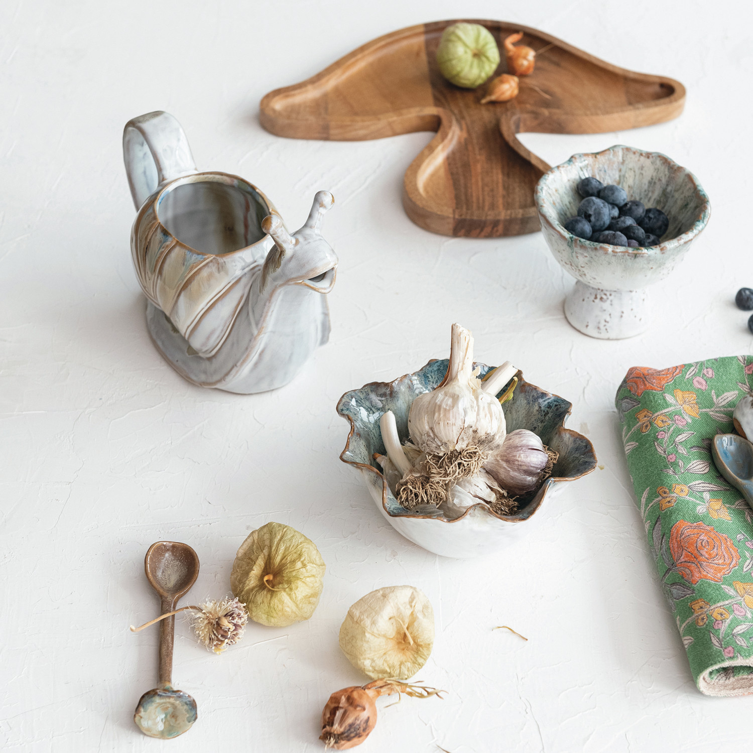 This Round Stoneware Bowl stands proudly on a flared foot, its rounded body coated in a green and brown speckled glaze that calls to mind the rich tapestry of a woodland clearing. The earthy tones and tactile finish evoke a sense of grounding and connection to the natural world, making it a serene addition to any home. Whether serving as a vessel for favorite snacks or as a standalone piece of art, this bowl's charming presence is a nod to the understated beauty of rustic life. It measures 4.25 inches in diameter and 3.75 inches in height, providing a compact yet visually striking presence. It's a functional piece that doesn't shy away from making a statement, embodying the spirit of pastoral elegance with a modern twist.