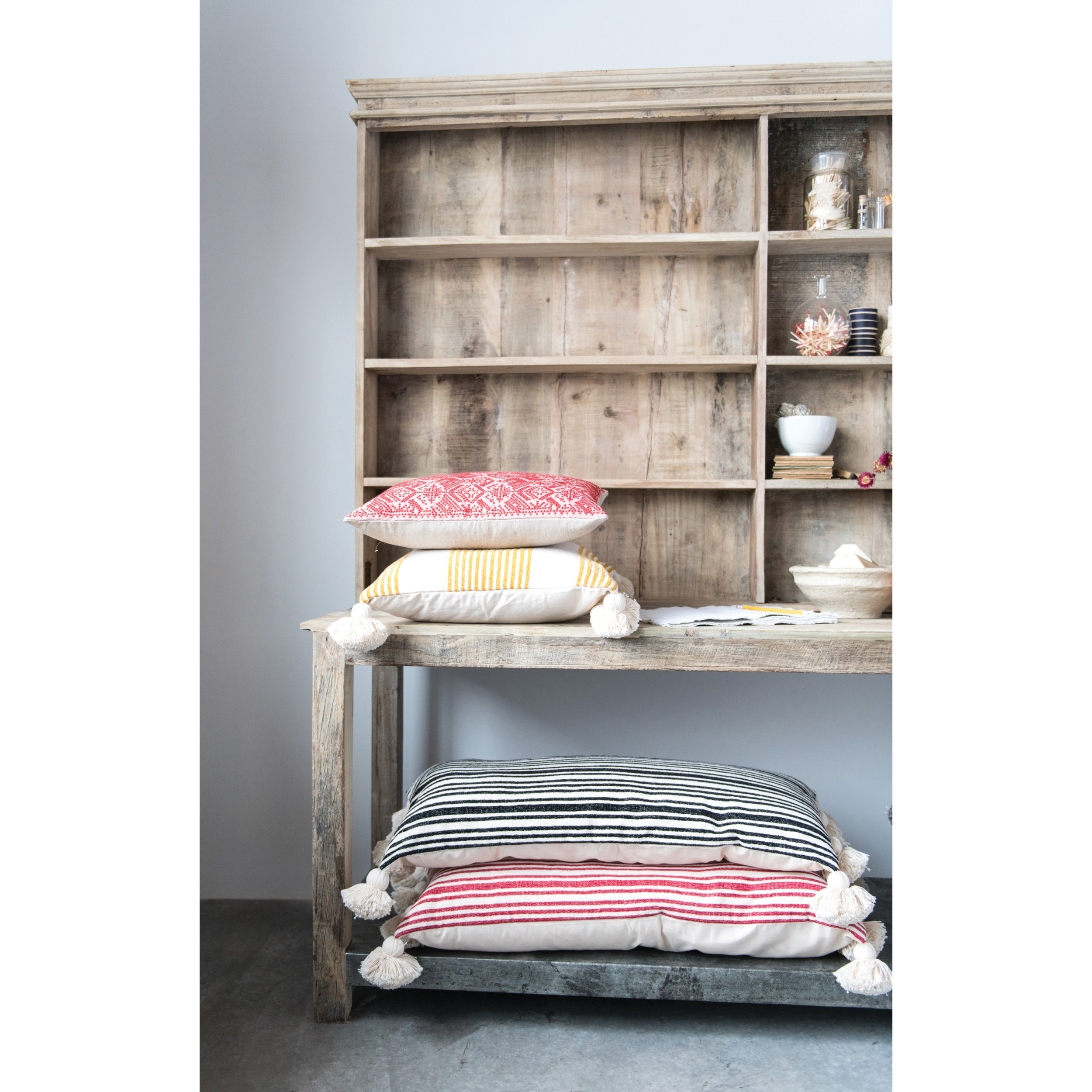 This gorgeous unit has decorative trim on top and a metal shelf on bottom. Perfect for the rustic decor, it provides shelf after shelf of space for displaying items. Ideal in the kitchen for dishes and an extra work space or in the main room for books and decorative objects.