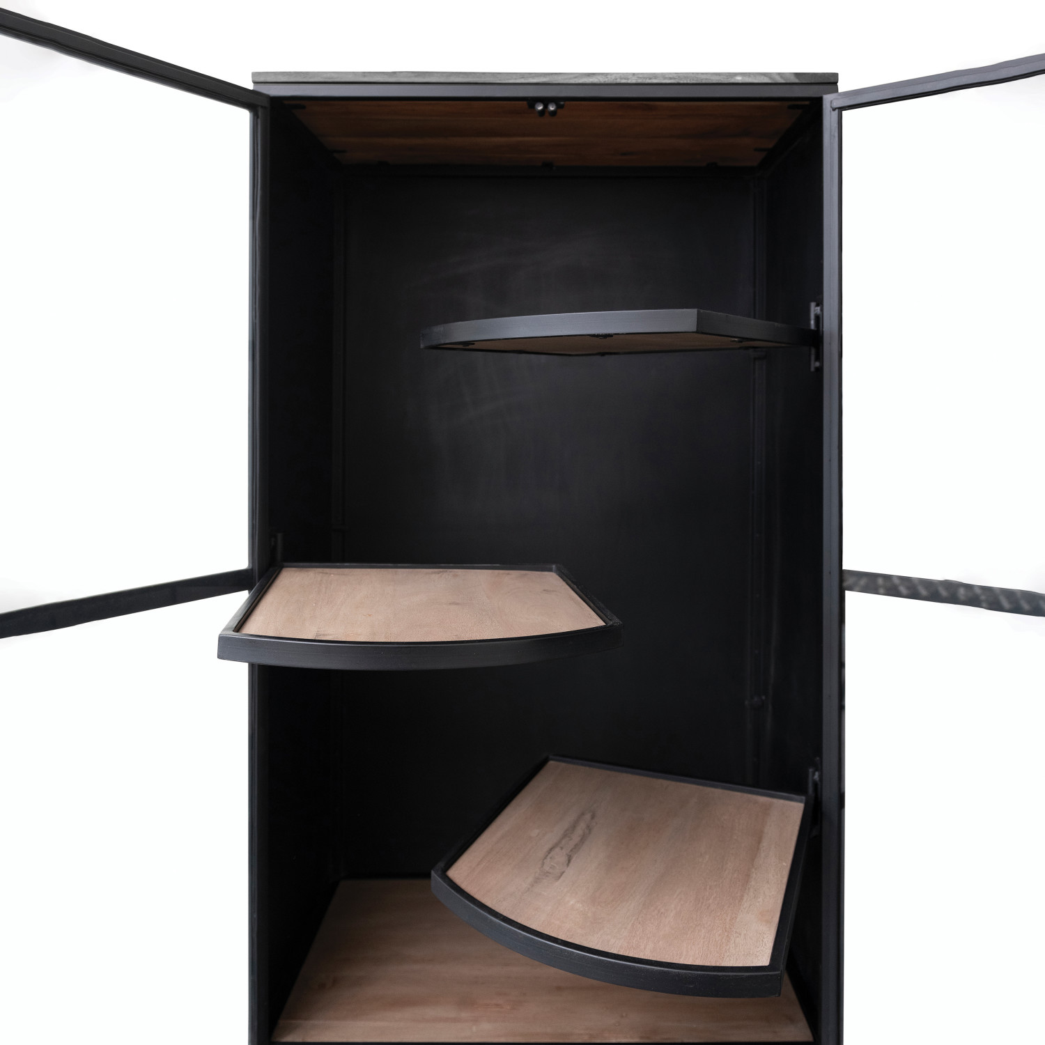 Add some style and functionality to any home with this acacia wood and metal cabinet with two glass doors. This cabinet offers a sleek and modern storage and display solution for any room. Whether used in the living room, dining room, bedroom, or office, this cabinet will provide ample space for any needs. The cabinet features two glass doors that allow one to showcase their prized possessions, such as books, dishes, collectibles, or photos. The three swivel shelves can rotate to suit one's preferences, and the four drawers with metal handles can keep any essentials organized, such as remote controls, DVDs, books, keys, mail, and more. This cabinet combines metal, acacia wood, and glass, and has a sleek grey finish that matches any décor. The cabinet has a sturdy weight capacity of 44 pounds for each shelf and 16.5 pounds for each drawer. Elevate any home with this acacia wood and metal cabinet with two glass doors. Enjoy a sleek and modern storage solution with this acacia wood and metal cabinet that features two glass doors, three swivel shelves, and four drawers. Ideal for a contemporary, minimalist, or industrial-style home, this cabinet can be used in the living room, dining room, bedroom, or office. The two glass doors allow anyone to display any books, dishes, collectibles, or photos, and the three swivel shelves can adjust to fit any needs. The cabinet is made of metal acacia wood and glass and has a black finish that complements any décor.