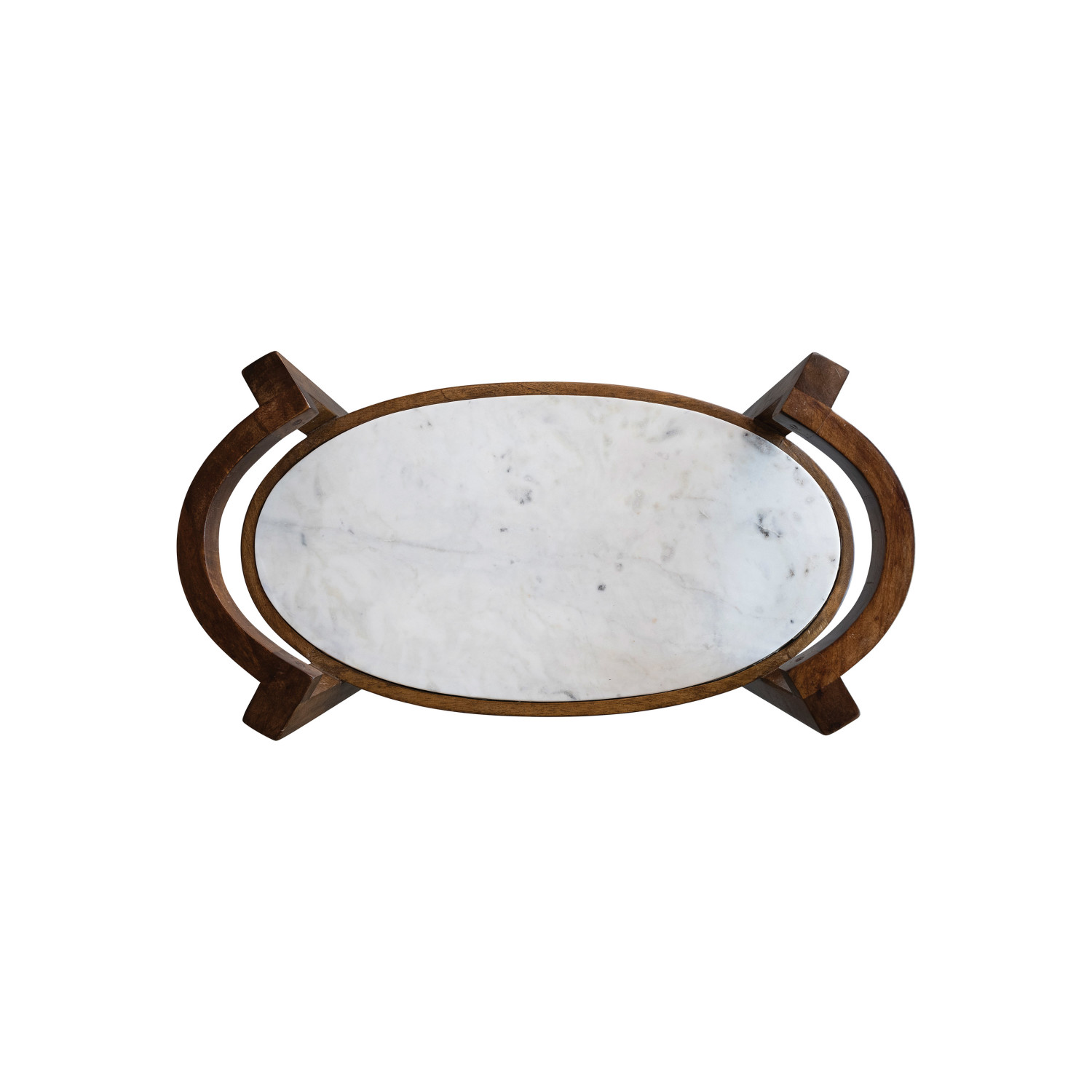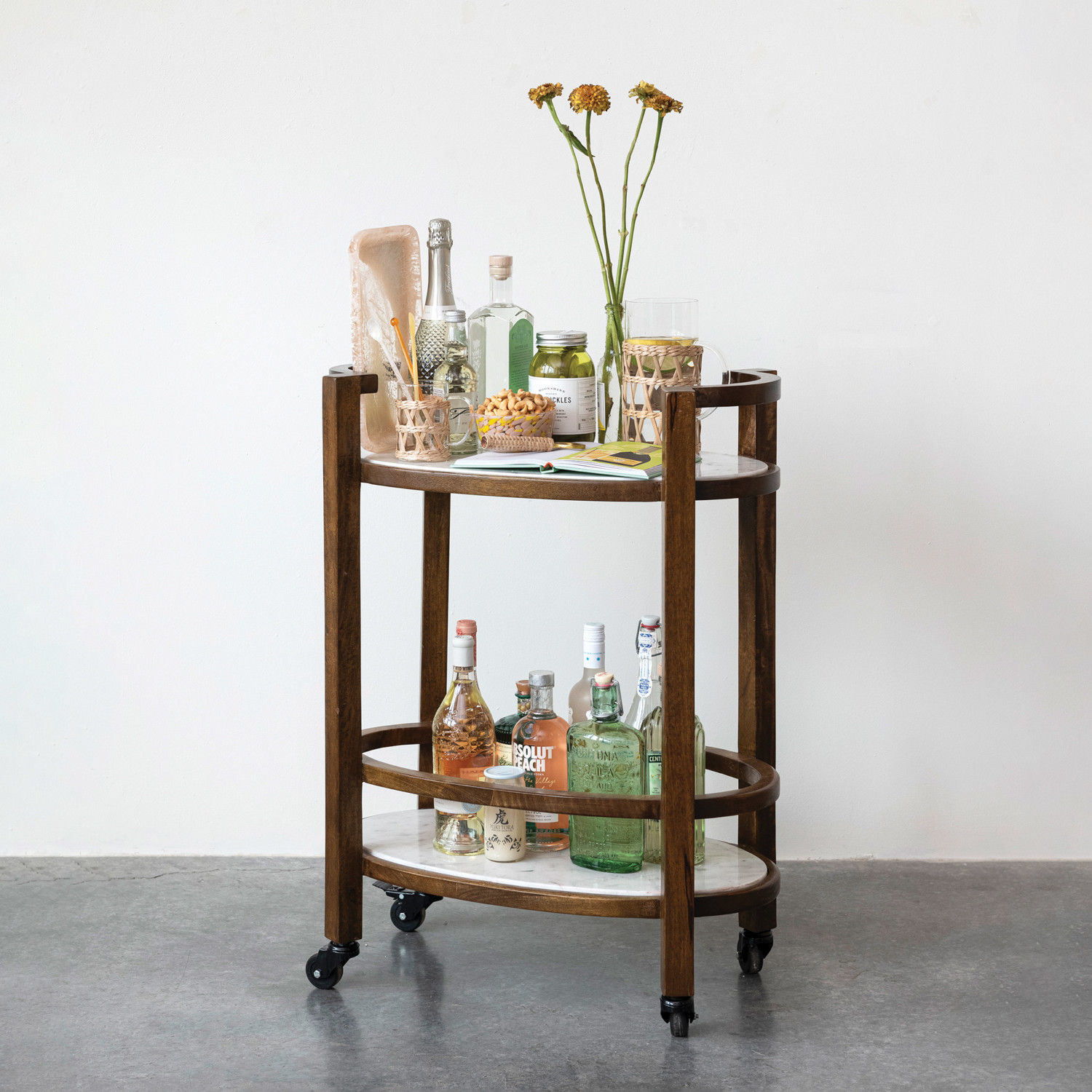 This mango wood and marble 2-tier bar cart in walnut finish and white is a versatile and elegant addition to any decor. It features a smooth mango wood frame and two marble shelves in a natural and luxurious finish. The contrast between the two materials creates a refined look, making it suitable for various settings like farmhouse, French country, mid-century modern, Scandinavian, or coastal themed decor. The cart is ideal for serving drinks, snacks, or appetizers, and its spacious design allows for easy mobility. It can be placed in various rooms, and its durable materials, such as mango wood and marble, make it easy to clean. The cart measures 25.5 inches in length, 14 inches in width, and 33.5 inches in height, making it a great gift for anyone.