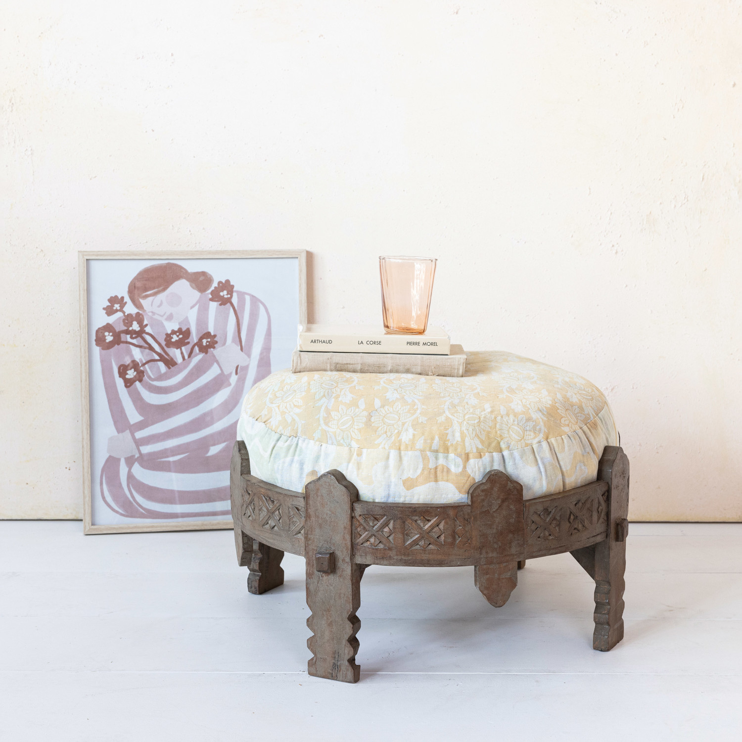 This unique and colorful stool features a carved reclaimed wood base and a vintage cotton kantha patchwork cushion in bleached and multi color. The stool is made of reclaimed wood and cotton, which are natural and eco-friendly materials that offer durability and comfort. The reclaimed wood has a bleached finish and a carved design that adds character and charm to the stool. The cotton kantha patchwork cushion has a multi color pattern that adds personality and vibrancy to the stool. The cushion is removable and has a zipper closure for easy cleaning. Use it as a stool, a footrest, or a side table, this stool will reflect light and create a cozy feel. The stool comes fully assembled and ready to use. It can be placed in the living room, bedroom, or any other cozy corner of the home. This stool is a unique piece of art that will enhance the home with its beauty and functionality. Each one will vary slightly in shape, size, and color, making it a one-of-a-kind item.