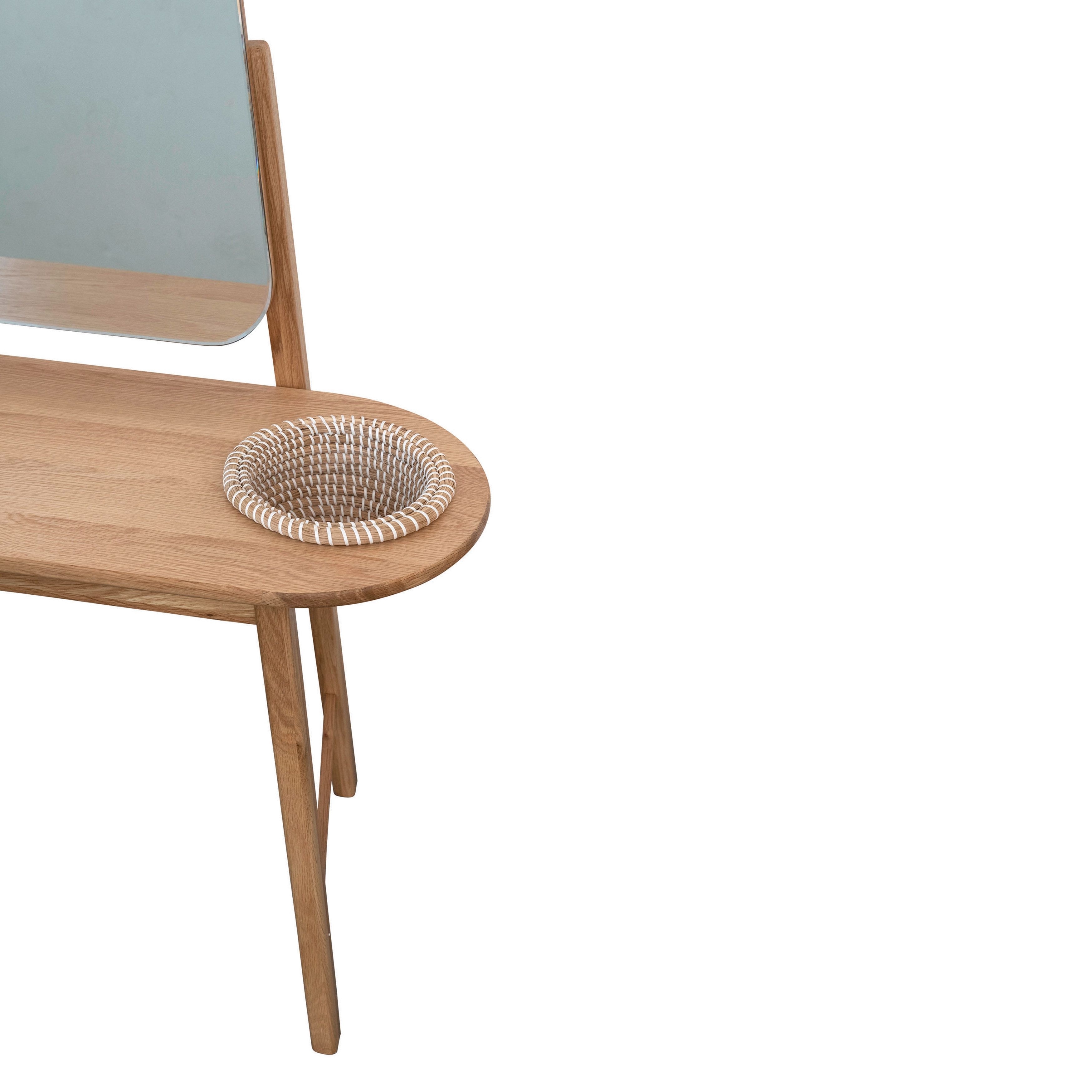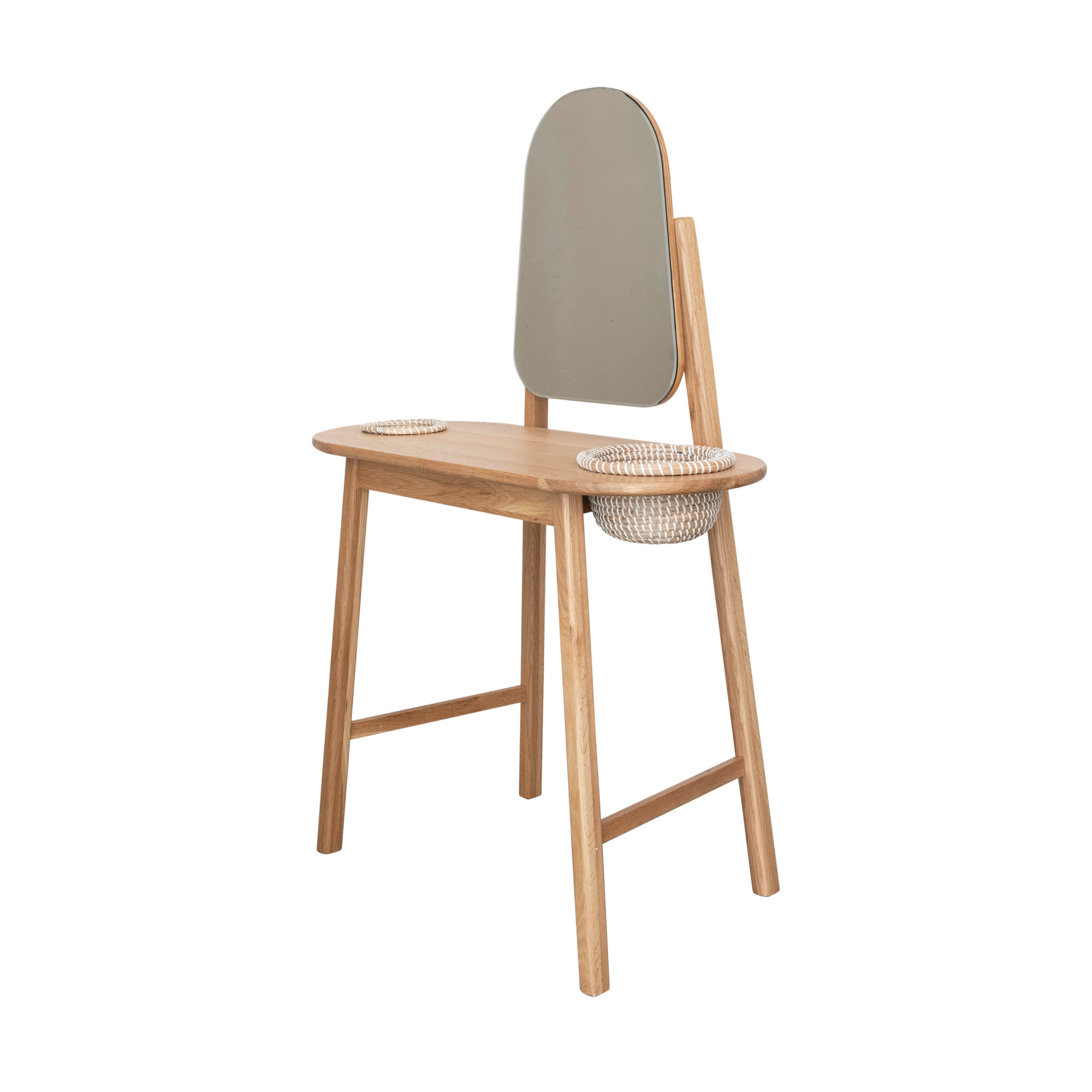 This strikingly modern take on a traditional vanity showcases oak wood in a mid-century inspired silhouette, adorned with an oblong mirror and 2 stylishly functional storage baskets. Oak wood and sustainable MDF vanity table with mirror and 2 rattan baskets. Create the ultimate bedroom oasis with this stunning vanity table. Made from oak wood, sustainable MDF, glass, and rattan.
