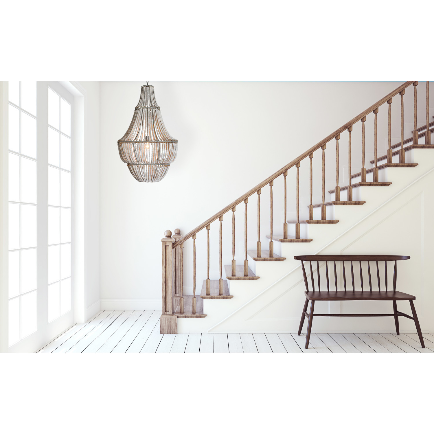 White washed wooden beads are strung along a metal infrastructure creating four opulent tiers that gracefully illuminate the room. One light in the center of the chandelier directs light out through the wooden strands of beads. Each tier is connected with different diameters of metal rings creating a multi-tiered effect.