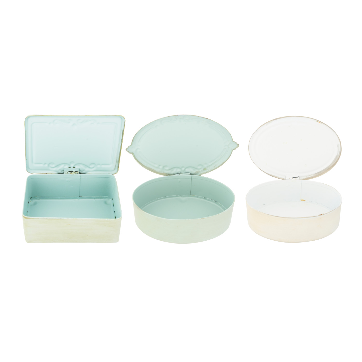 Jewelry or miscellaneous items can be stored in these precious metal boxes. The lids are attached making them easy to quickly lift for access of their contents. Use for any small items like pins, needle and thread, packets of gum or loose change.