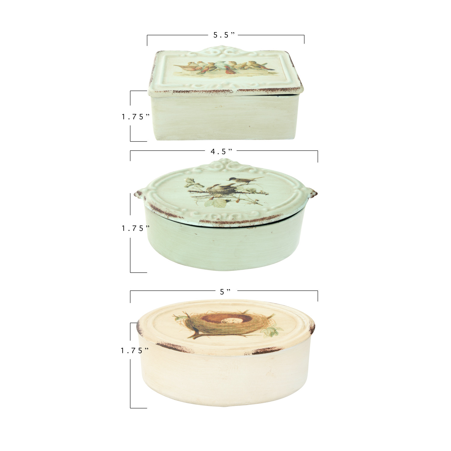 Catalog Name: 5-1/2"L, 5-1/4"L & 4-1/2"L Metal Box w/ Birds & Nest, Distressed Finish, 3 Styles
