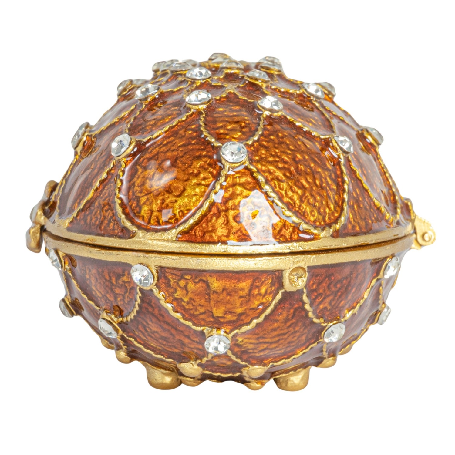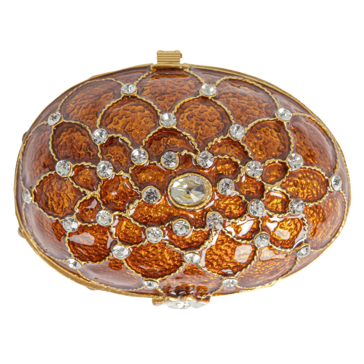 Catalog Name: 3-1/2"L x 2-1/4"W x 2-1/4"H Enameled Metal Egg Shaped Trinket Box w/ Jewels, Gold Finish & Amber Color