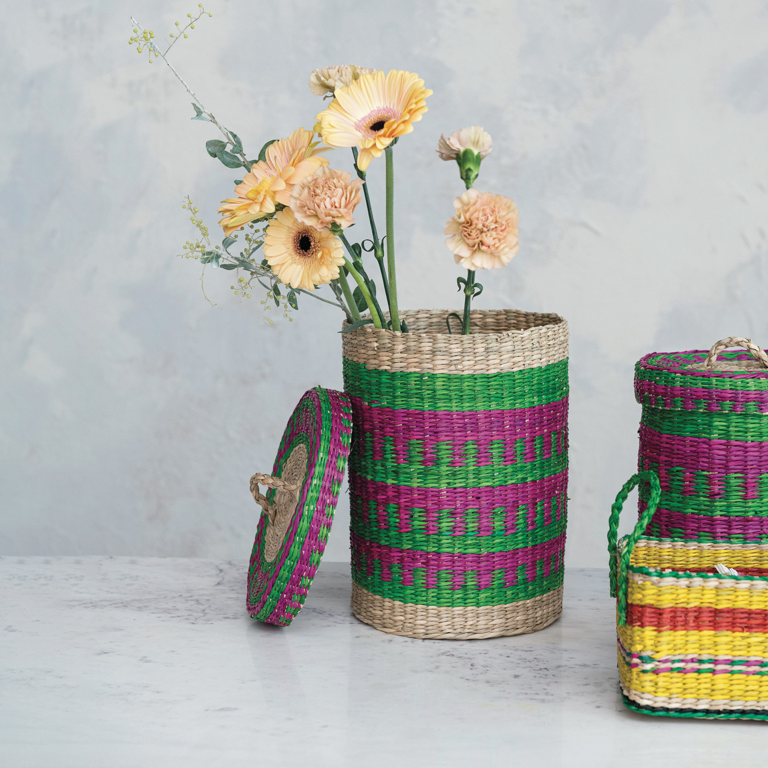 Catalog Name: 8-3/4" Round x 11"H & 7" Round x 9-3/4"H Hand-Woven Seagrass Baskets w/ Lids & Stripes, Green, Pink & Natural, Set of 2