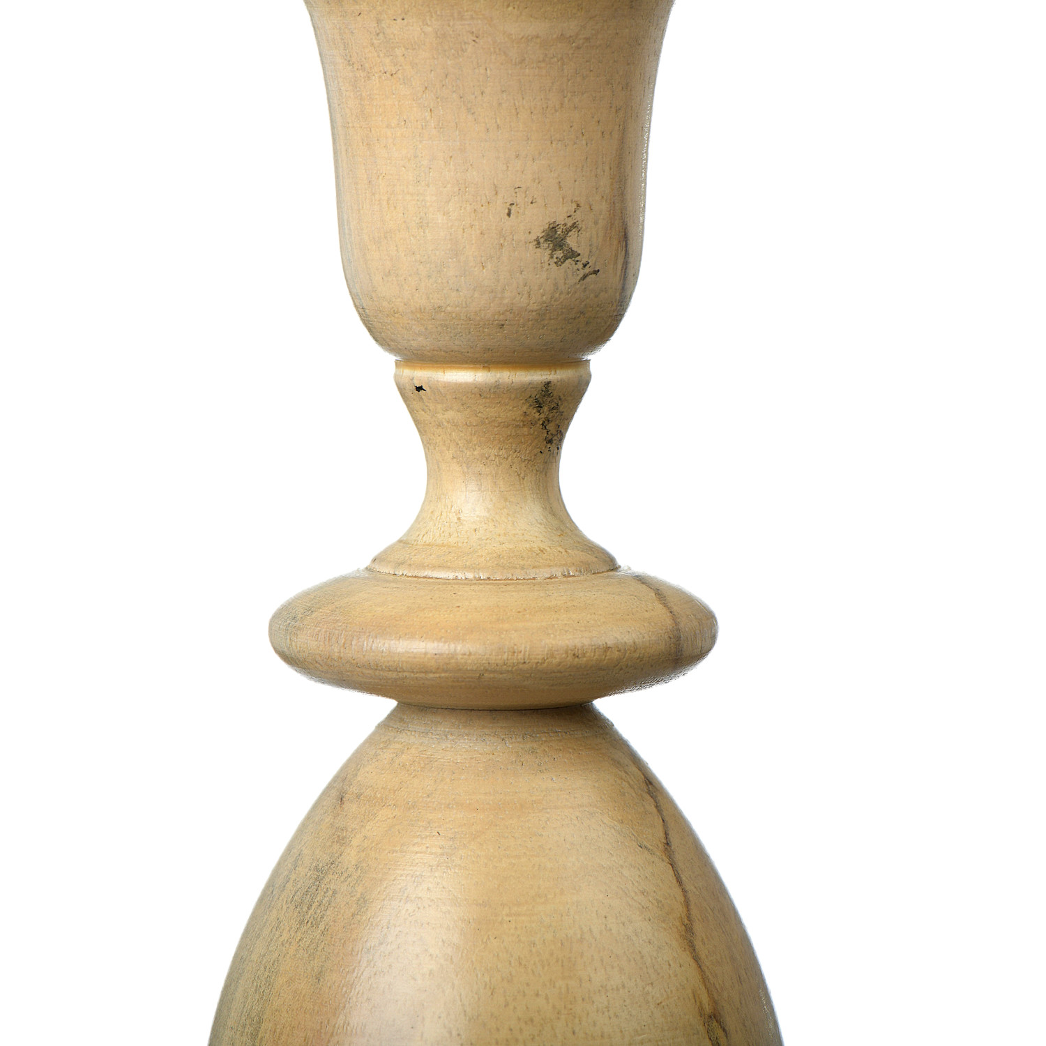 This set of candle holders is a crafted from 100% natural mango wood. The patina has a natural and polished wood look. Both candle holders have fluted shapes with rounded details. The shape resembles an hourglass, as the base and top are the widest parts and the center is cinched. The candle holders hold standard taper candles.