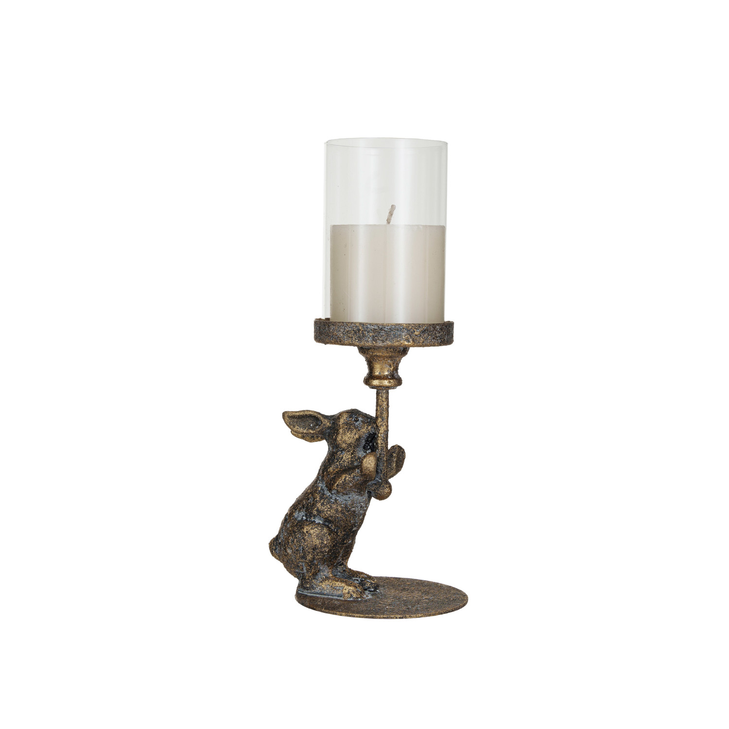 Catalog Name: 5-1/2"L x 4-1/2"W x 11-3/4"H Metal Rabbit Candle Holder w/ Glass Hurricane, Distressed Antique Brass Finish (Holds 3" Pillar)