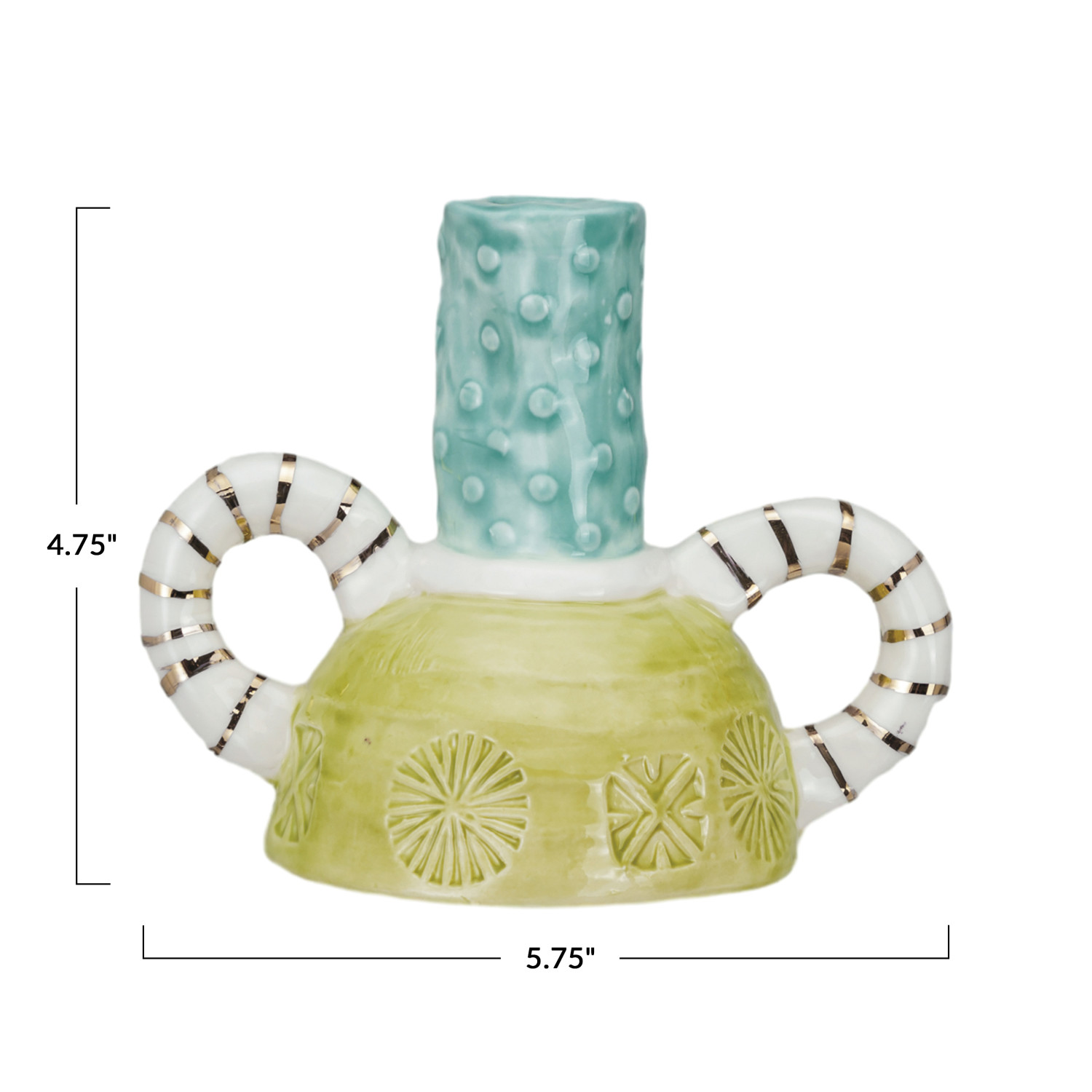 Catalog Name: 5-3/4"L x 3-3/4"W x 4-3/4"H Hand-Painted Stoneware Taper Holder w/ Handles, Design & Gold Electroplating, Reactive Glaze, Green, Teal & White (Each One Will Vary) ©