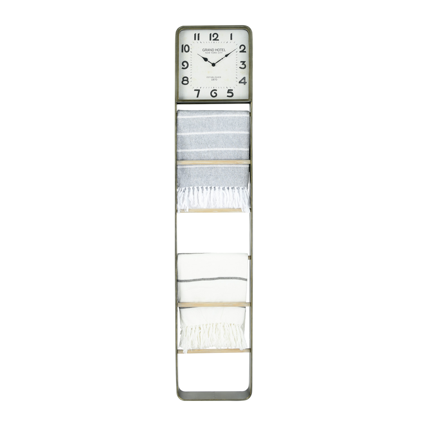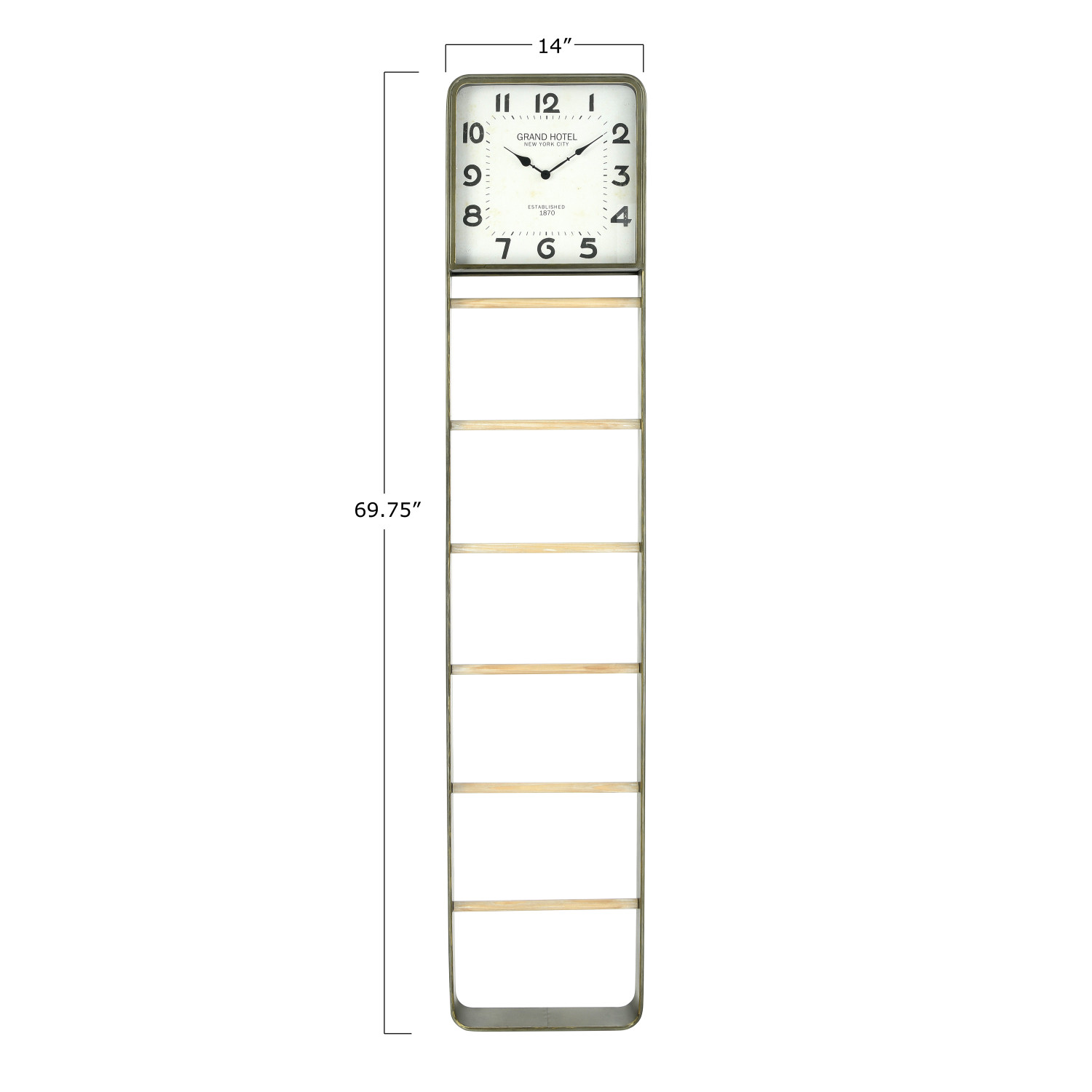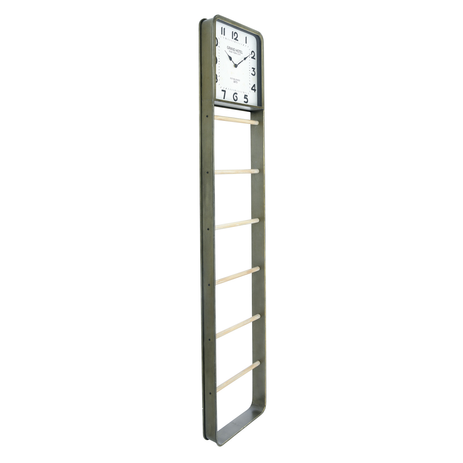With a tall vertical design, this decorative ladder and clock can be displayed against a wall in any room of the house. Simply lean it against a wall that needs a clock and fill the rods with decorative throws, scarves or towels. In an office setting, hang a selection of magazines with half of the pages hanging on either side of the rods.
