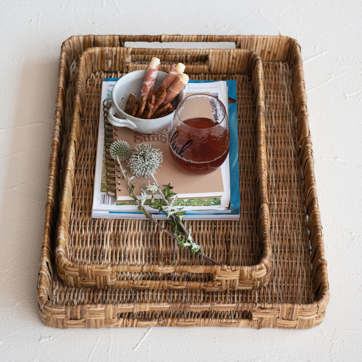 Catalog Name: 22"L x 16"W x 2-1/2"H & 18"L x 12"W x 2-1/2"H Decorative Hand-Woven Rattan Trays w/ Handles, Natural, Set of 2