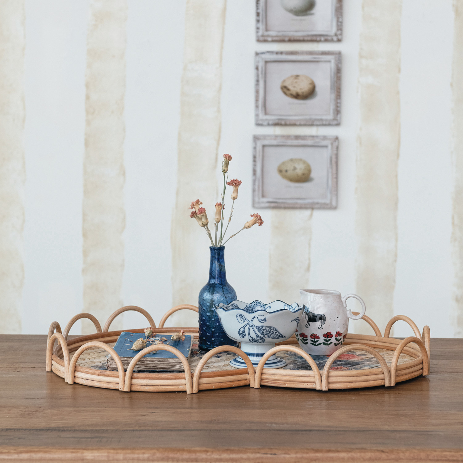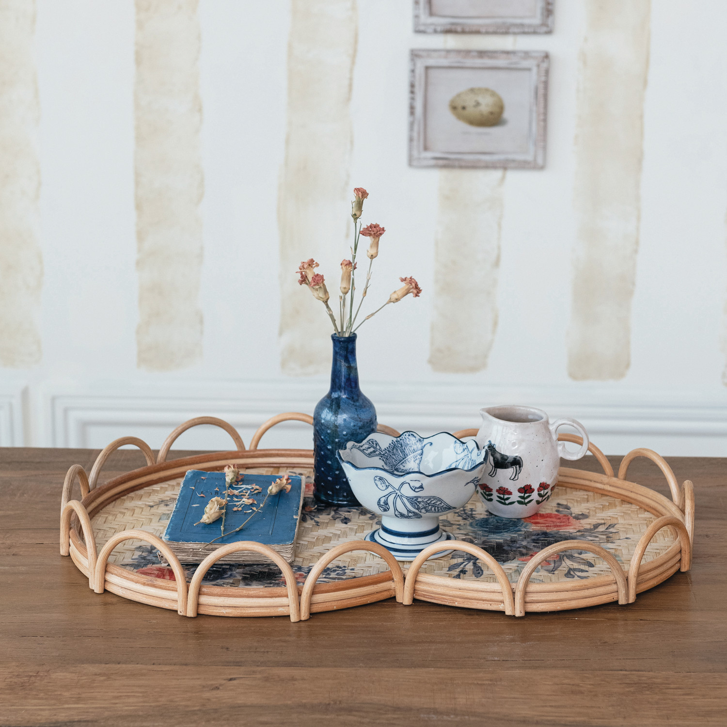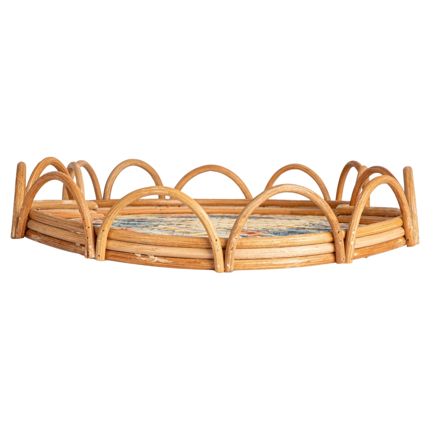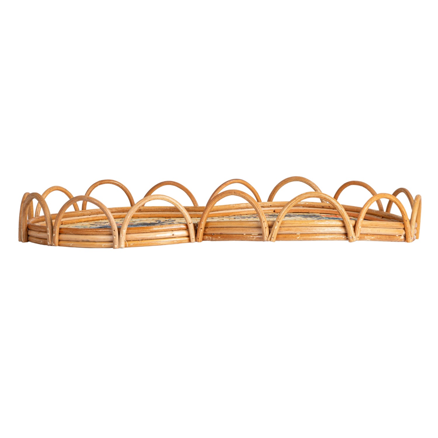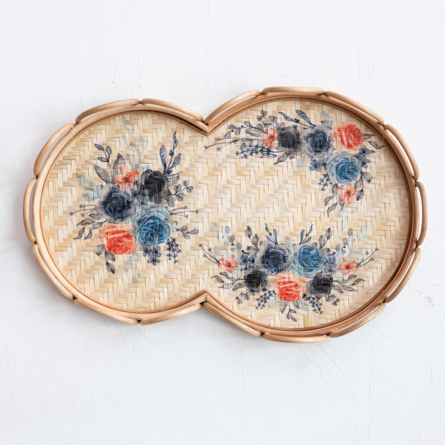 Catalog Name: 23-1/4"L x 15"W x 2-1/4"H Decorative Rattan & Bamboo Scalloped Tray w/ Printed Florals, Multi Color