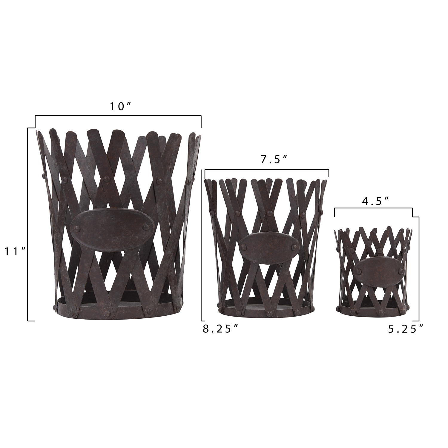 The sides on these planters are designed after an accordion style gate. There are large openings throughout for full view of its contents. Fill each with a potted plant or other items. If wanting to vary their uses, place a small plastic bag in the large and use for a garbage can while placing pillar candles in the two smaller ones.