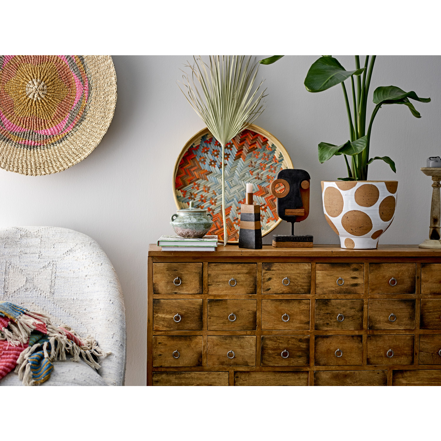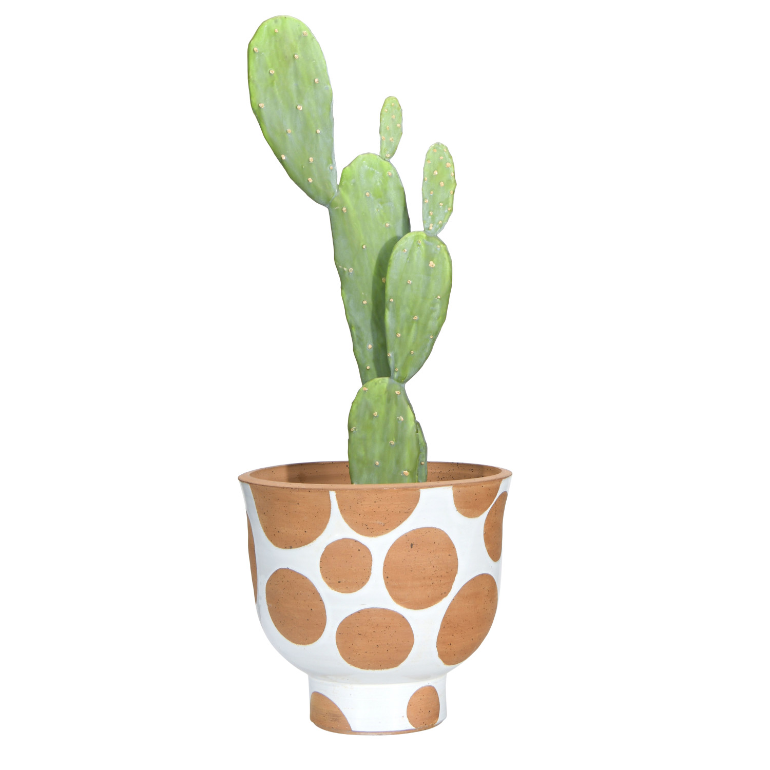 This terra-cotta pot has a white glaze with large and small natural terra-cotta dots carved into the clay. The planter has a circular base that extends up to hold the larger bowl shape. Place the pot indoors or outdoors. Add color with flowers and plants to really make this piece pop.