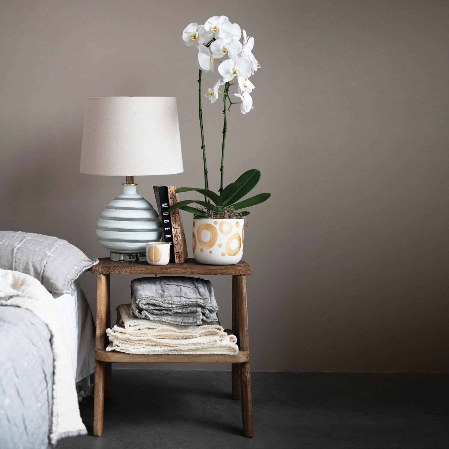 Catalog Name: 6-1/2" Round x 6"H Hand-Painted Stoneware Planter w/ Circle Design, White & Gold Color (Holds 5" Pot)
