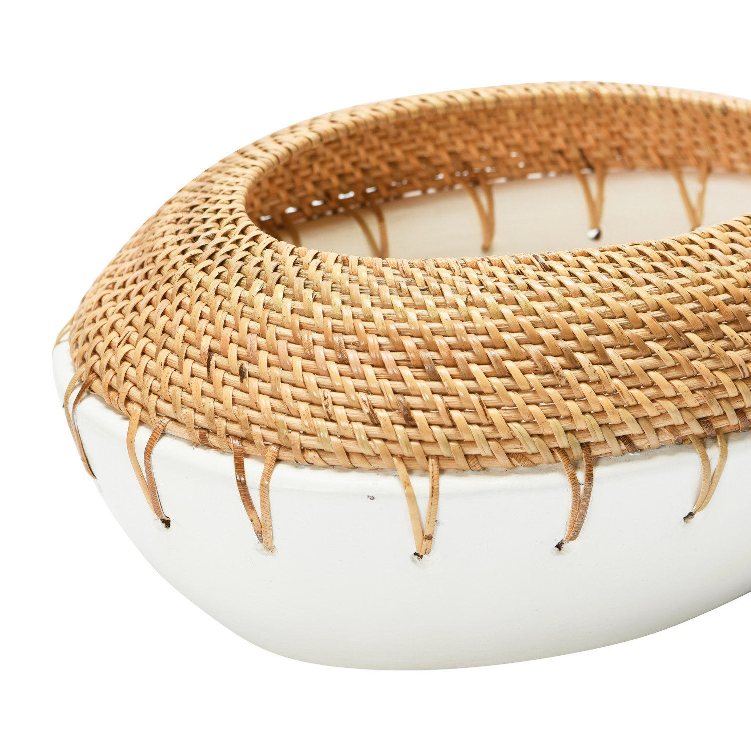 Catalog Name: 11-1/4" Round x 4-1/2"H Handmade Terra-cotta Planter w/ Hand-Woven Rattan Stitching, White & Natural, Truck Ship (Holds 10" Pot)