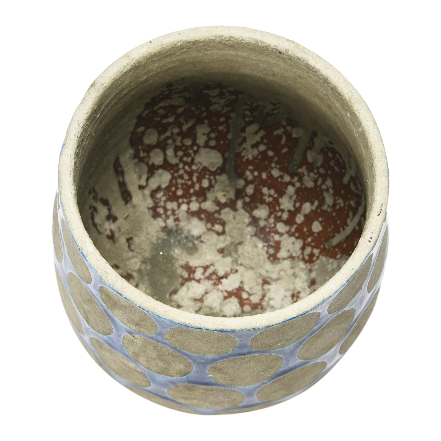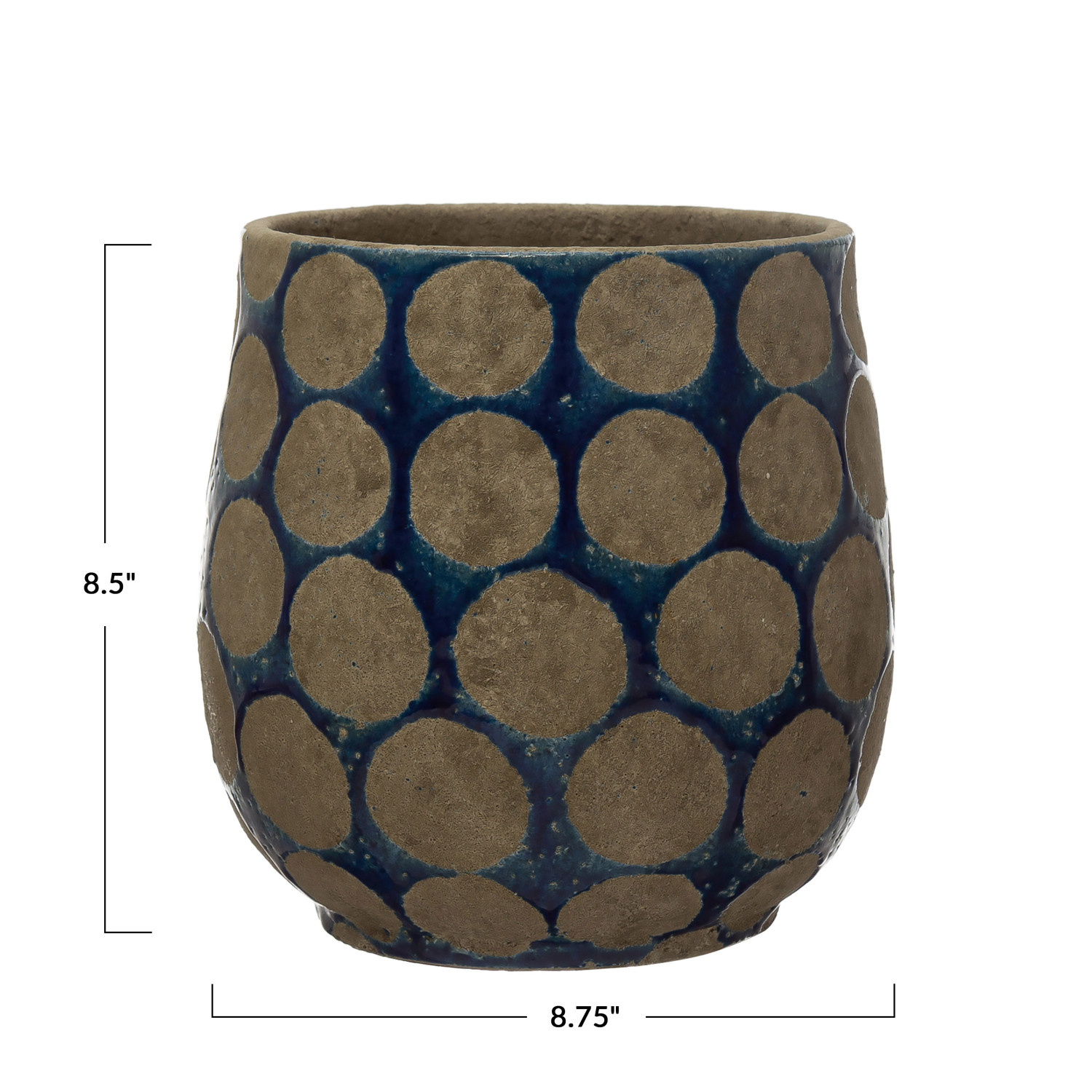 Catalog Name: 8-3/4" Round x 8-1/2"H Terra-cotta Planter w/ Wax Relief Dots, Dark Blue & Cement Color, Truck Ship (Holds 8" Pot)