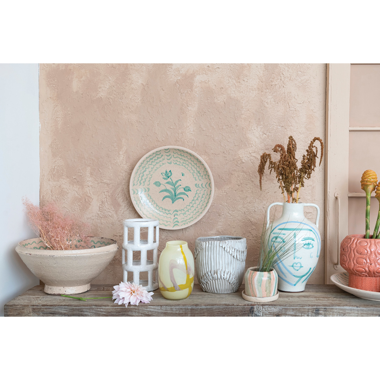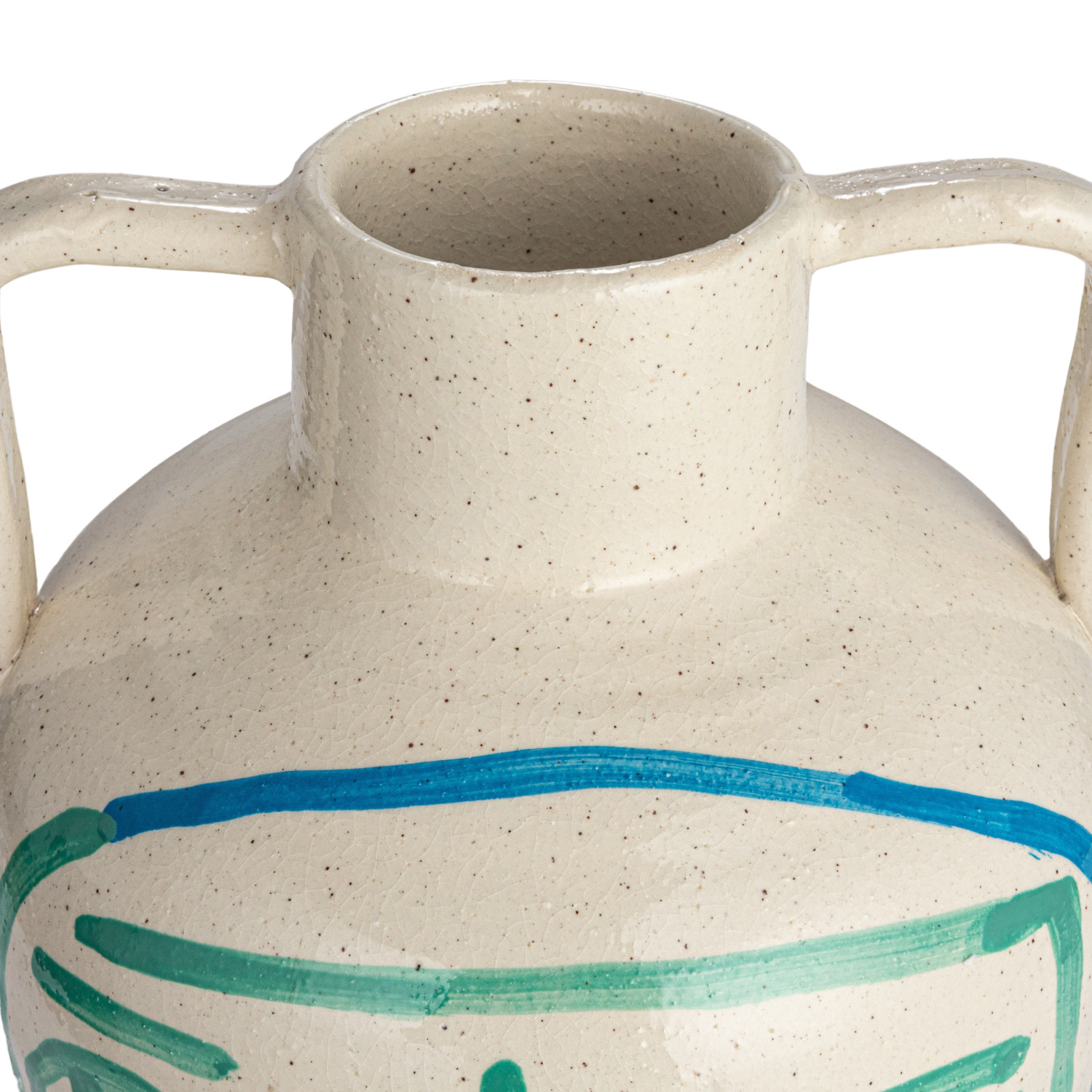 This hand-painted terra-cotta vase features an abstract face and crackle glaze in white, blue, and aqua colors. It is a unique and beautiful home accessory, made of baked clay with a porous and earthy texture. The vase has a round shape and wide opening, and its hand-painted design adds a playful and artistic touch. The crackle glaze creates a glossy surface, while the white, blue, and aqua color scheme adds a cozy and elegant look. This vase can be used to display fresh or artificial flowers, plants, or branches, or as a sculptural accent. Place it on tables, shelves, mantels, or windowsills, and create a cozy and inviting atmosphere in the home. It is suitable for farmhouse, coastal, French country, cottagecore, or boho style and adds personality and charm to any space. Truck shipping is required due to its size and weight.