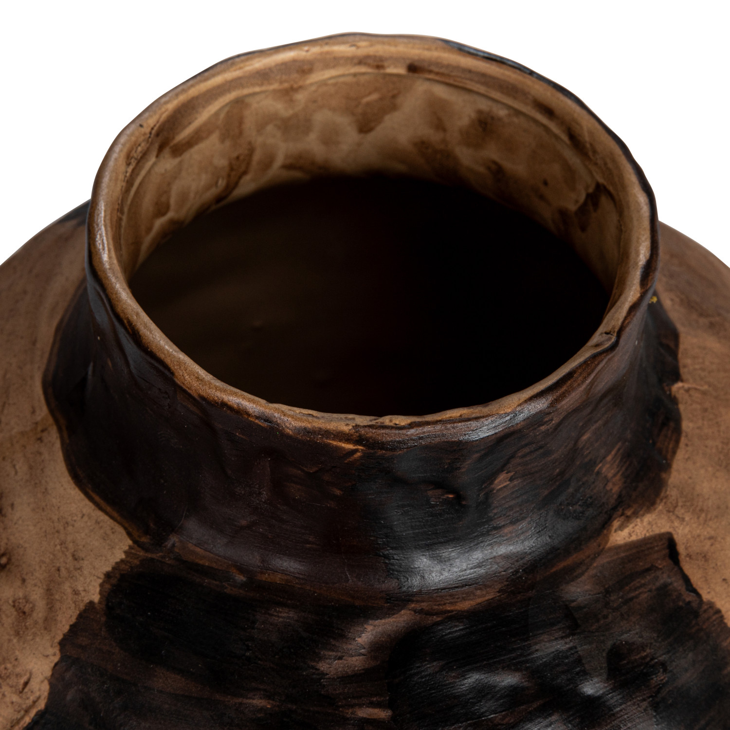 This round stoneware vase with a hand-painted design and black and cream reactive glaze is a stylish and artistic home accessory. Made of stoneware, fired at high temperatures, it has a round shape and wide opening. The hand-painted design contrasts with black and cream colors, creating a chic and modern look. The reactive glaze creates a smooth, shiny surface with a unique color and pattern. This vase can hold fresh or artificial flowers, plants, or branches, or serve as a decorative accent. It can be placed in any room of the house, creating an elegant space. Suitable for farmhouse, French country, boho, or transitional styles, it adds character and sophistication to any space. Each vase will vary slightly in color and pattern due to the hand-painted design and reactive glaze process.