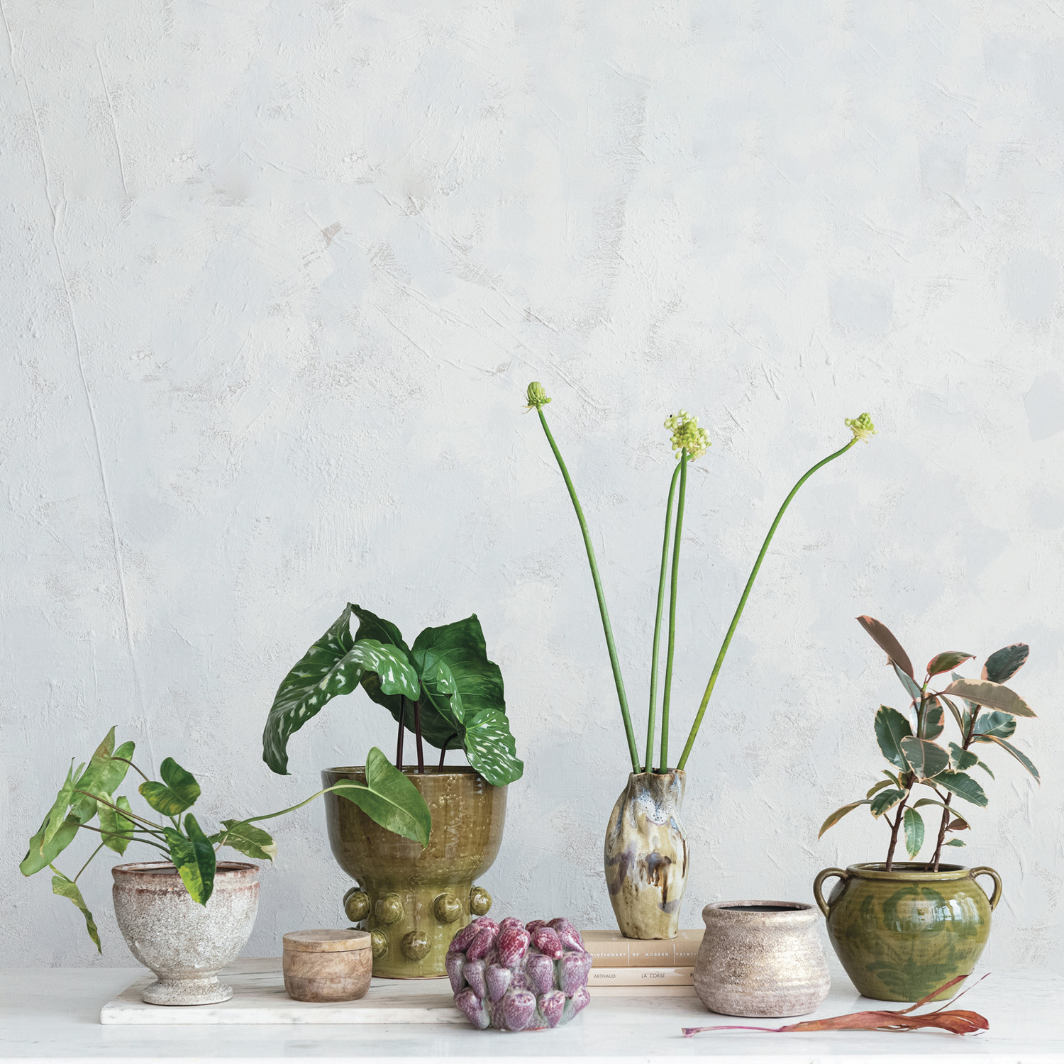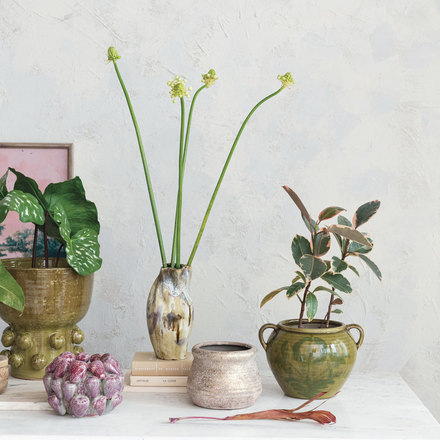 This Hand-Painted Stoneware Vase captures the essence of artisanal craftsmanship with its unique organic shape and a reactive glaze that creates a multi-colored finish. Each vase is a singular work of art, reflecting a blend of Scandinavian simplicity, farmhouse warmth, cottagecore charm, French country elegance, and coastal freshness. The robust stoneware material ensures longevity, making it not just a decorative item but a durable addition to the home. With dimensions of 5.25 inches in length, 5 inches in width, and 10.25 inches in height, it's perfectly sized to make a statement without overwhelming the space.